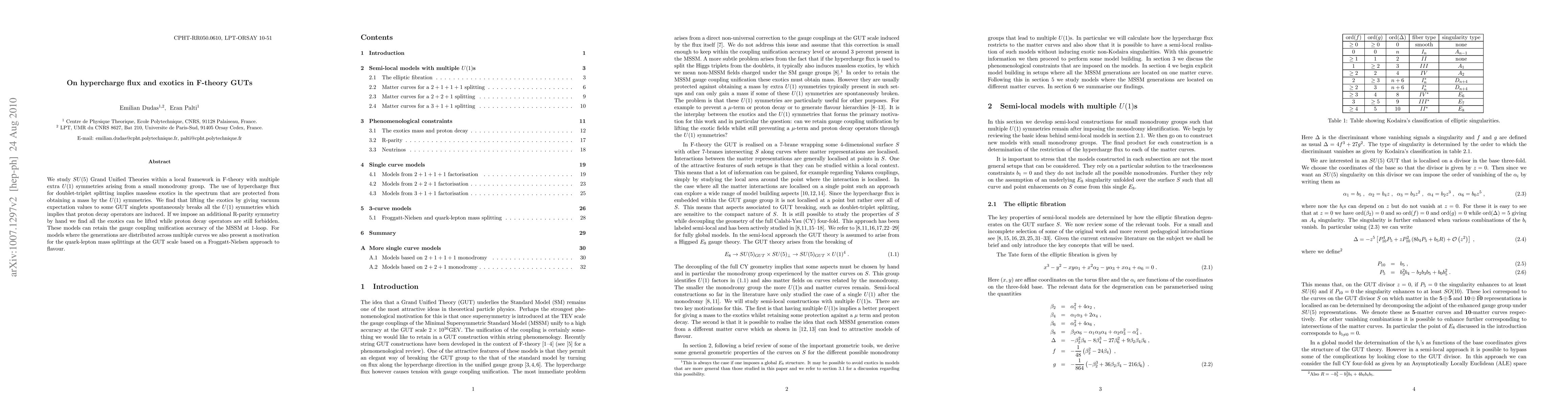 This paper explores SU(5) Grand Unified Theories in F-theory with extra U(1) symmetries, revealing that hypercharge flux leads to massless exotic particles protected by U(1) symmetries. Spontaneous breaking of these symmetries lifts the exotics but induces proton decay, which can be prevented by imposing an additional R-parity symmetry.