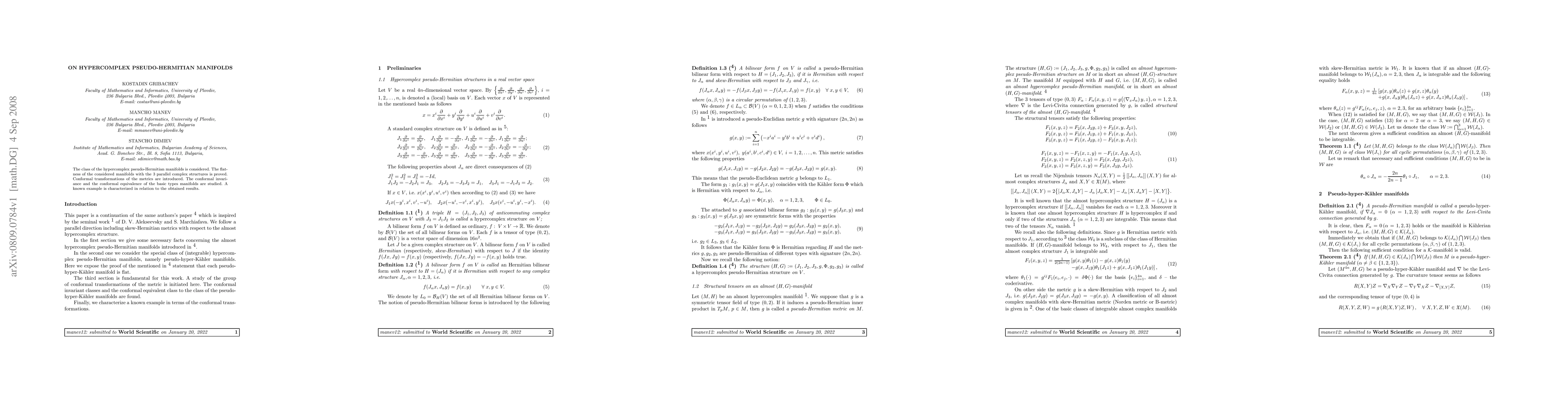 The class of the hypercomplex pseudo-Hermitian manifolds is considered. The flatness of the considered manifolds with the 3 parallel complex structures is proved. Conformal transformations of the metrics are introduced. The conformal invariance and the conformal equivalence of the basic types manifolds are studied. A known example is characterized in relation to the obtained results.