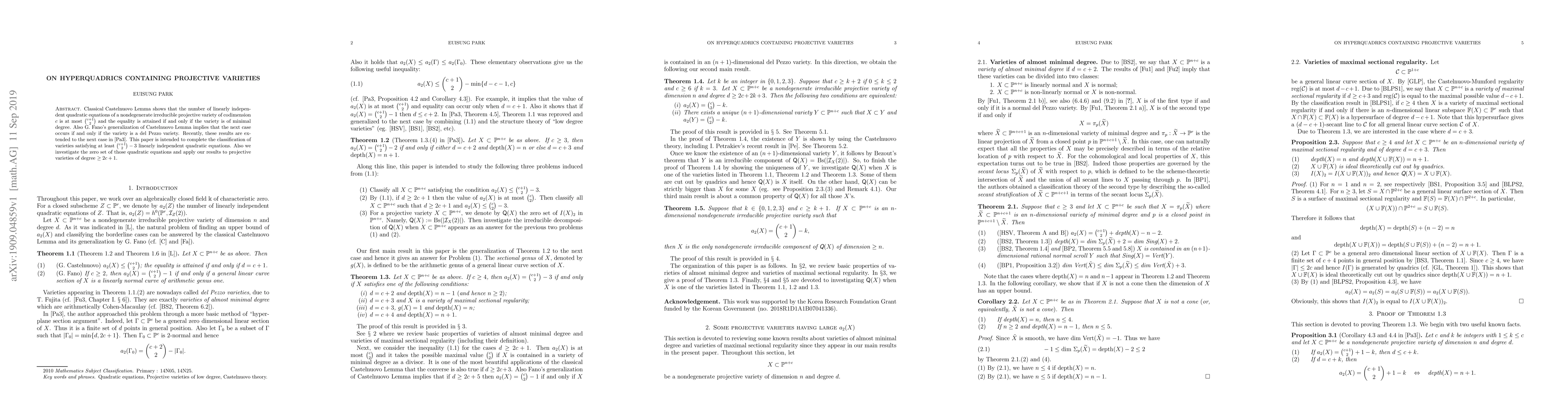 Classical Castelnuovo Lemma shows that the number of linearly independent quadratic equations of a nondegenerate irreducible projective variety of codimension $c$ is at most ${{c+1} \choose {2}}$ and the equality is attained if and only if the variety is of minimal degree. Also G. Fano's generalization of Castelnuovo Lemma implies that the next case occurs if and only if the variety is a del Pezzo variety. Recently, these results are extended to the next case. This paper is intended to complete the classification of varieties satisfying at least ${{c+1} \choose {2}}-3$ linearly independent quadratic equations. Also we investigate the zero set of those quadratic equations and apply our results to projective varieties of degree $\geq 2c+1$.
