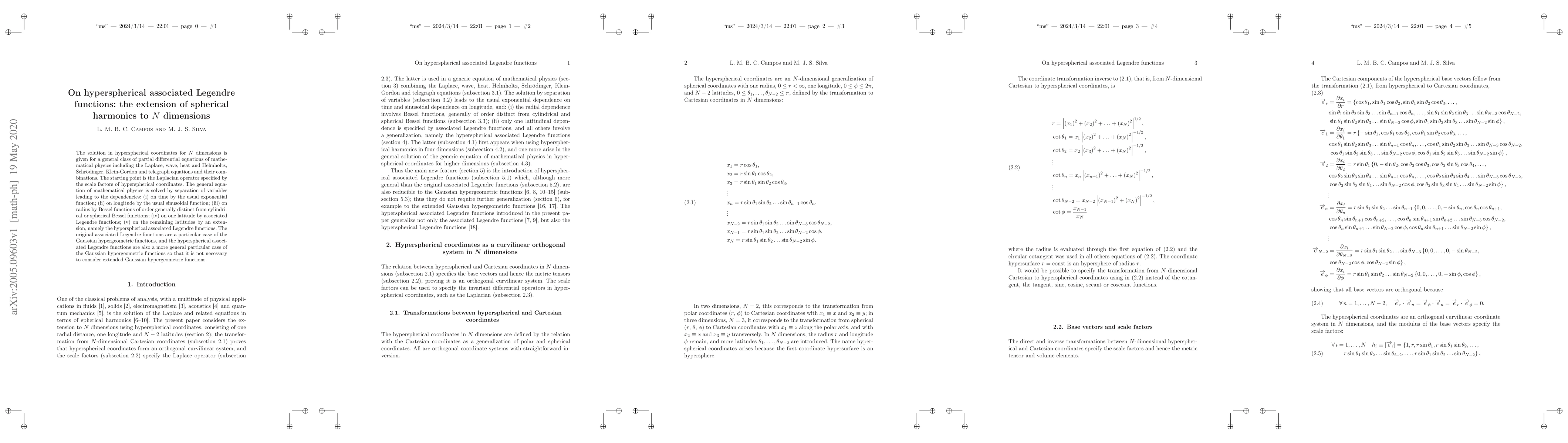 The solution in hyperspherical coordinates for $N$ dimensions is given for a general class of partial differential equations of mathematical physics including the Laplace, wave, heat and Helmholtz, Schr\"{o}dinger, Klein-Gordon and telegraph equations and their combinations. The starting point is the Laplacian operator specified by the scale factors of hyperspherical coordinates. The general equation of mathematical physics is solved by separation of variables leading to the dependencies: (i) on time by the usual exponential function; (ii) on longitude by the usual sinusoidal function; (iii) on radius by Bessel functions of order generally distinct from cylindrical or spherical Bessel functions; (iv) on one latitude by associated Legendre functions; (v) on the remaining latitudes by an extension, namely the hyperspherical associated Legendre functions. The original associated Legendre functions are a particular case of the Gaussian hypergeometric functions, and the hyperspherical associated Legendre functions are also a more general particular case of the Gaussian hypergeometric functions so that it is not necessary to consider extended Gaussian hypergeometric functions.