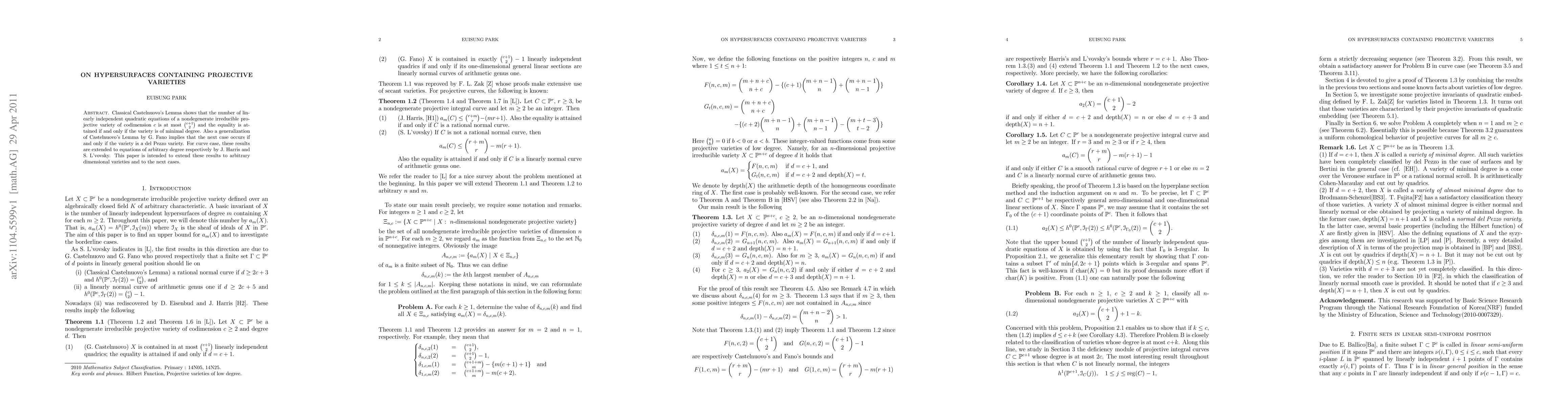 Classical Castelnuovo's Lemma shows that the number of linearly independent quadratic equations of a nondegenerate irreducible projective variety of codimension $c$ is at most ${{c+1} \choose {2}}$ and the equality is attained if and only if the variety is of minimal degree. Also a generalization of Castelnuovo's Lemma by G. Fano implies that the next case occurs if and only if the variety is a del Pezzo variety. For curve case, these results are extended to equations of arbitrary degree respectively by J. Harris and S. L'vovsky. This paper is intended to extend these results to arbitrary dimensional varieties and to the next cases.