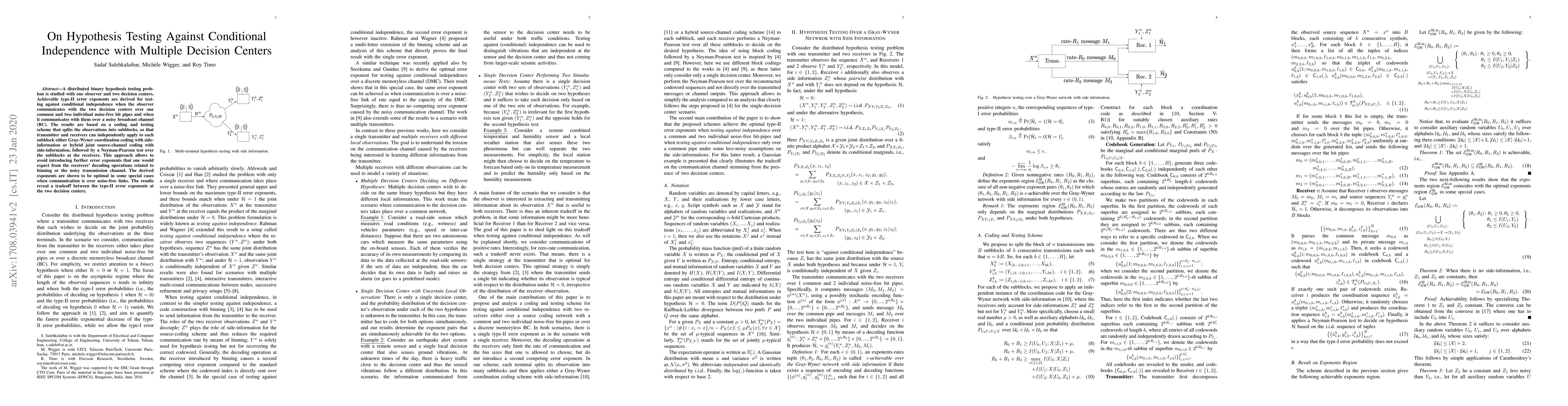 This paper studies distributed binary hypothesis testing with one observer and two decision centers, deriving achievable type-II error exponents for testing against conditional independence. The optimal coding and testing scheme avoids additional error from decoding operations, revealing a tradeoff between error exponents at the two decision centers.