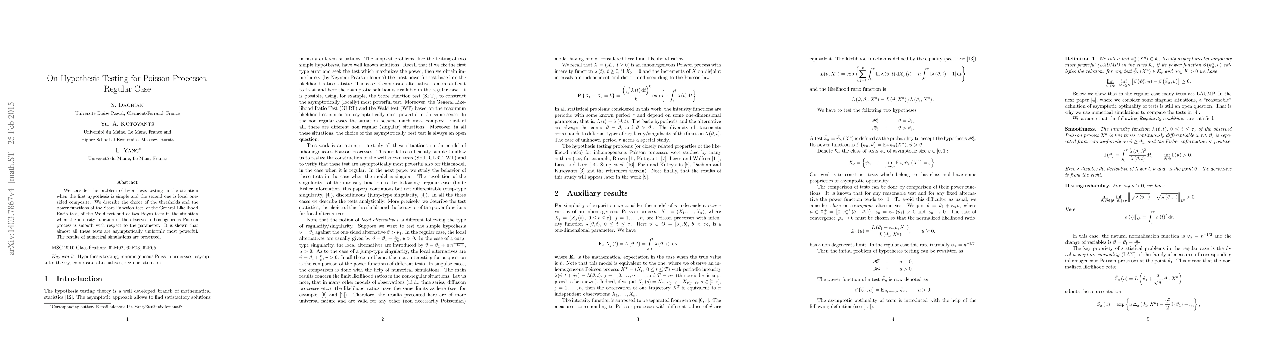 This paper examines hypothesis testing for Poisson processes, focusing on the comparison of various tests including the Score Function test, General Likelihood Ratio test, Wald test, and two Bayes tests. It demonstrates that most of these tests are asymptotically uniformly most powerful under smooth intensity functions. Numerical simulations support the theoretical findings.