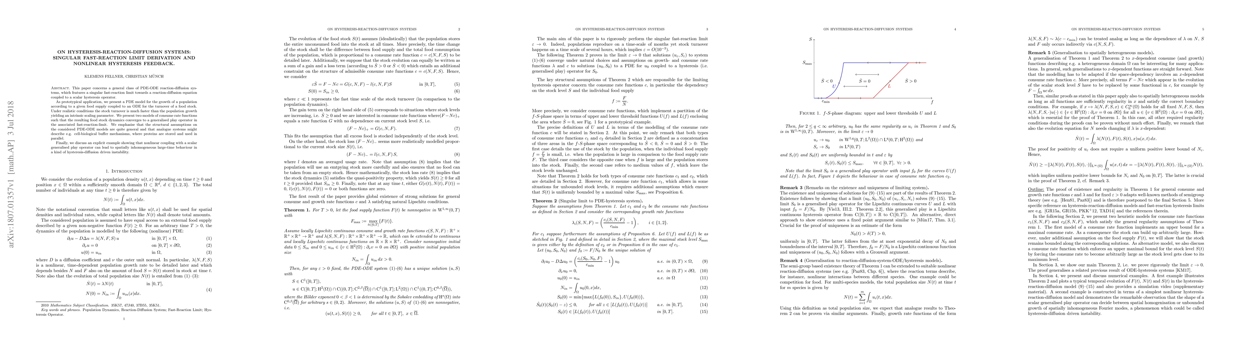 This paper investigates PDE-ODE reaction-diffusion systems with a singular fast-reaction limit, deriving a coupled reaction-diffusion equation with a scalar hysteresis operator. It applies this to a population growth model with a much faster food stock turnover, demonstrating convergence to a generalised play operator and discussing potential biological applications.