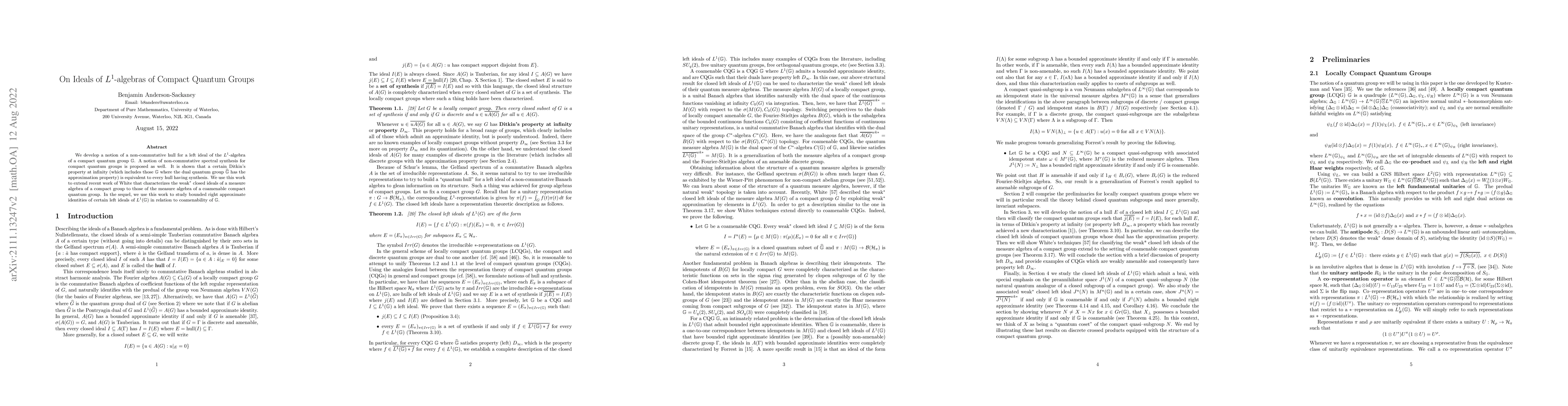 We develop a notion of a non-commutative hull for a left ideal of the $L^1$-algebra of a compact quantum group $\mathbb{G}$. A notion of non-commutative spectral synthesis for compact quantum groups is proposed as well. It is shown that a certain Ditkin's property at infinity (which includes those $\mathbb{G}$ where the dual quantum group $\widehat{\mathbb{G}}$ has the approximation property) is equivalent to every hull having synthesis. We use this work to extend recent work of White that characterizes the weak$^*$ closed ideals of a measure algebra of a compact group to those of the measure algebra of a coamenable compact quantum group. In the sequel, we use this work to study bounded right approximate identities of certain left ideals of $L^1(\mathbb{G})$ in relation to coamenability of $\mathbb{G}$.