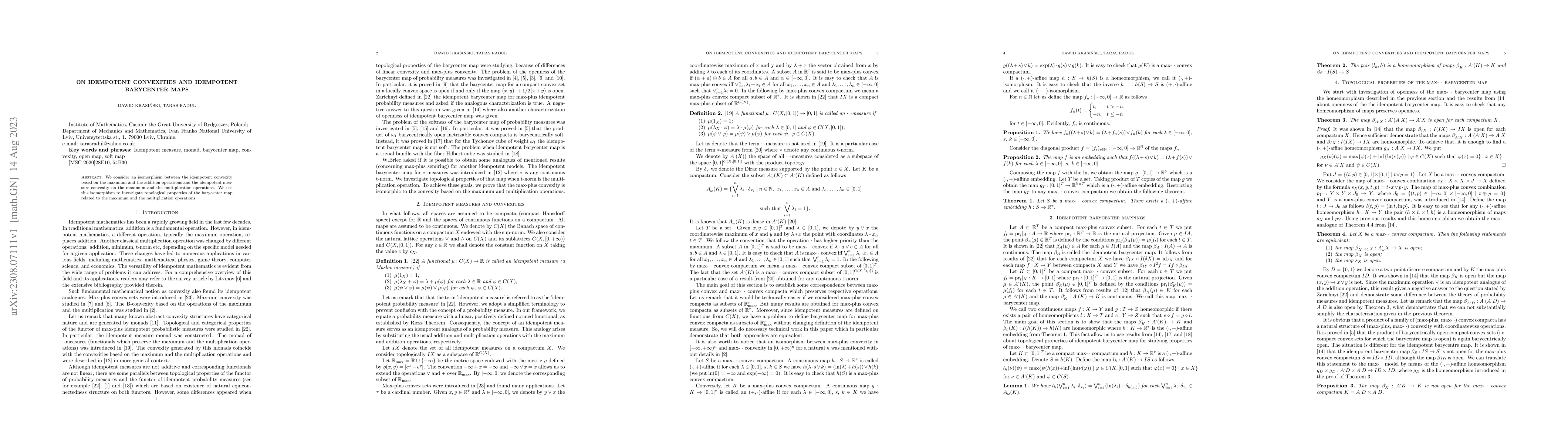 This paper establishes an isomorphism between idempotent convexity based on maximum and addition and idempotent measure convexity based on maximum and multiplication, then uses this to explore topological properties of the barycenter map associated with the maximum and multiplication operations.