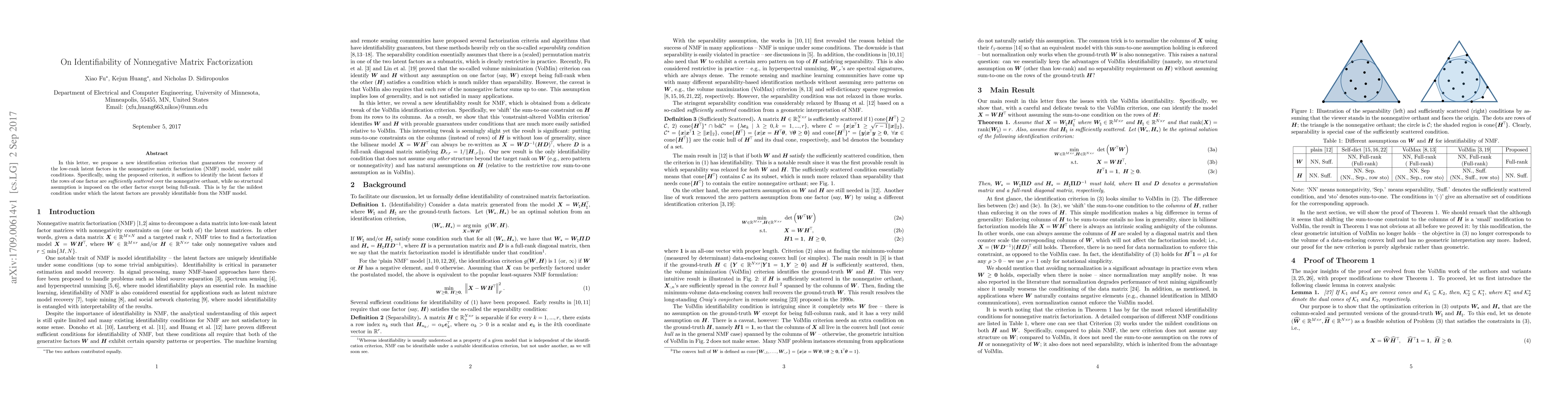 This paper introduces a new identifiability criterion for nonnegative matrix factorization (NMF) that ensures the recovery of low-rank latent factors with minimal assumptions. It requires only that the rows of one factor are sufficiently scattered in the nonnegative orthant, without imposing structural assumptions on the other factor, which must only be full-rank.
