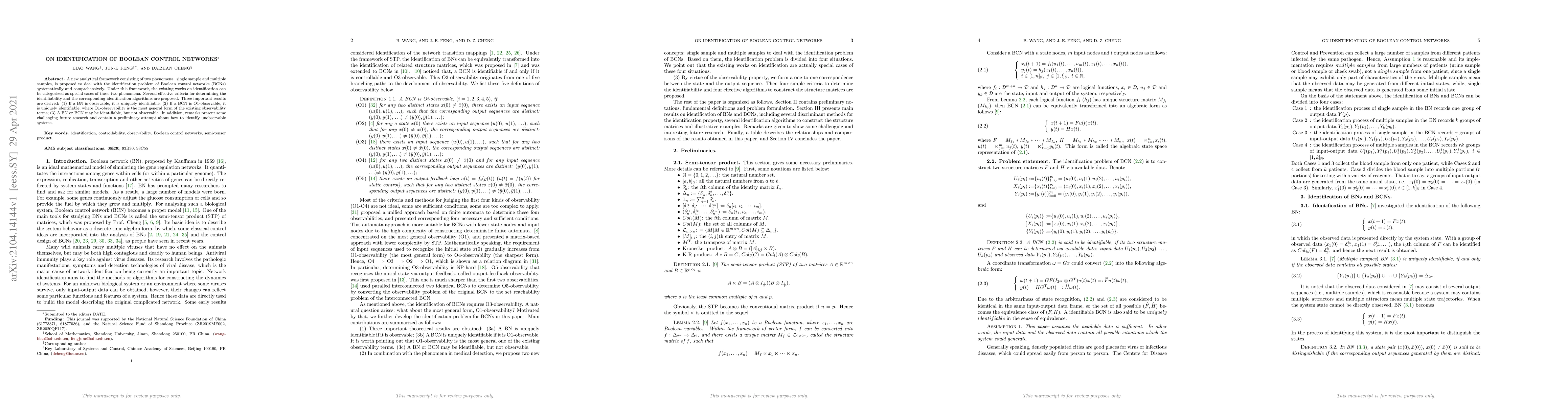This paper proposes a new analytical framework for identifying Boolean control networks (BCNs) through single and multiple sample approaches. It establishes criteria for identifiability and proposes algorithms, proving that observable BCNs are uniquely identifiable and introducing O1-observability as the most general observability term.