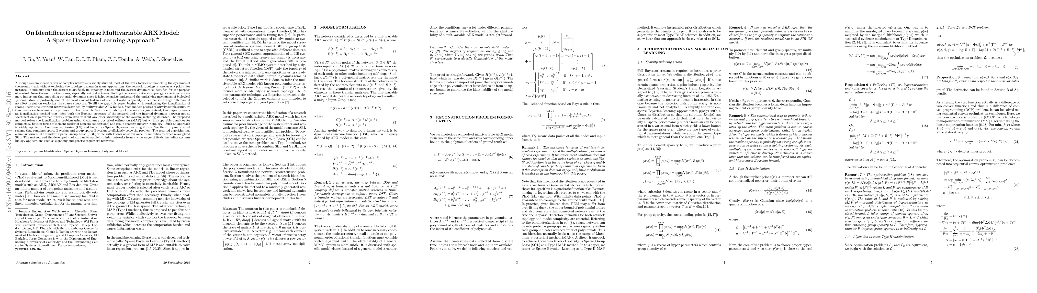 This paper begins with considering the identification of sparse linear time-invariant networks described by multivariable ARX models. Such models possess relatively simple structure thus used as a benchmark to promote further research. With identifiability of the network guaranteed, this paper presents an identification method that infers both the Boolean structure of the network and the internal dynamics between nodes. Identification is performed directly from data without any prior knowledge of the system, including its order. The proposed method solves the identification problem using Maximum a posteriori estimation (MAP) but with inseparable penalties for complexity, both in terms of element (order of nonzero connections) and group sparsity (network topology). Such an approach is widely applied in Compressive Sensing (CS) and known as Sparse Bayesian Learning (SBL). We then propose a novel scheme that combines sparse Bayesian and group sparse Bayesian to efficiently solve the problem. The resulted algorithm has a similar form of the standard Sparse Group Lasso (SGL) while with known noise variance, it simplifies to exact re-weighted SGL. The method and the developed toolbox can be applied to infer networks from a wide range of fields, including systems biology applications such as signaling and genetic regulatory networks.