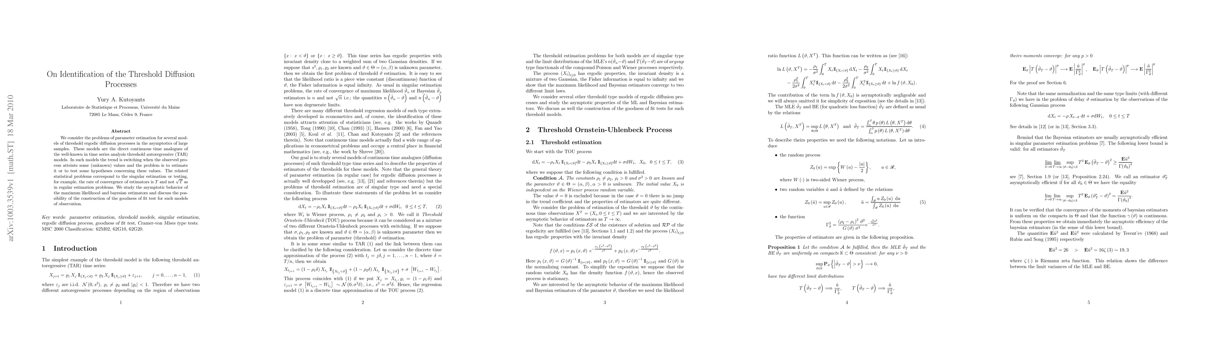 We consider the problems of parameter estimation for several models of threshold ergodic diffusion processes in the asymptotics of large samples. These models are the direct continuous time analogues of the well-known in time series analysis threshold autoregressive (TAR) models. In such models the trend is switching when the observed process atteints some (unknown) values and the problem is to estimate it or to test some hypotheses concerning these values. The related statistical problems correspond to the singular estimation or testing, for example, the rate of convergence of estimators is $T$ and not $\sqrt{T}$ as in regular estimation problems. We study the asymptotic behavior of the maximum likelihood and bayesian estimators and discuss the possibility of the construction of the goodness of fit test for such models of observation.