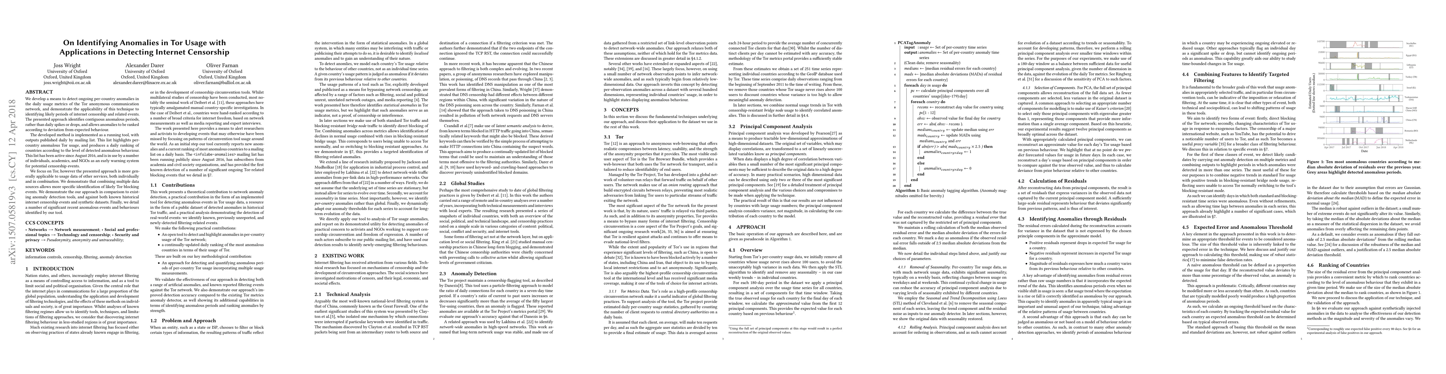 This paper develops a method to detect anomalies in Tor usage metrics, identifying potential periods of internet censorship. The tool ranks countries based on detected anomalies and has been operational since 2016, serving as an early warning system for censorship.