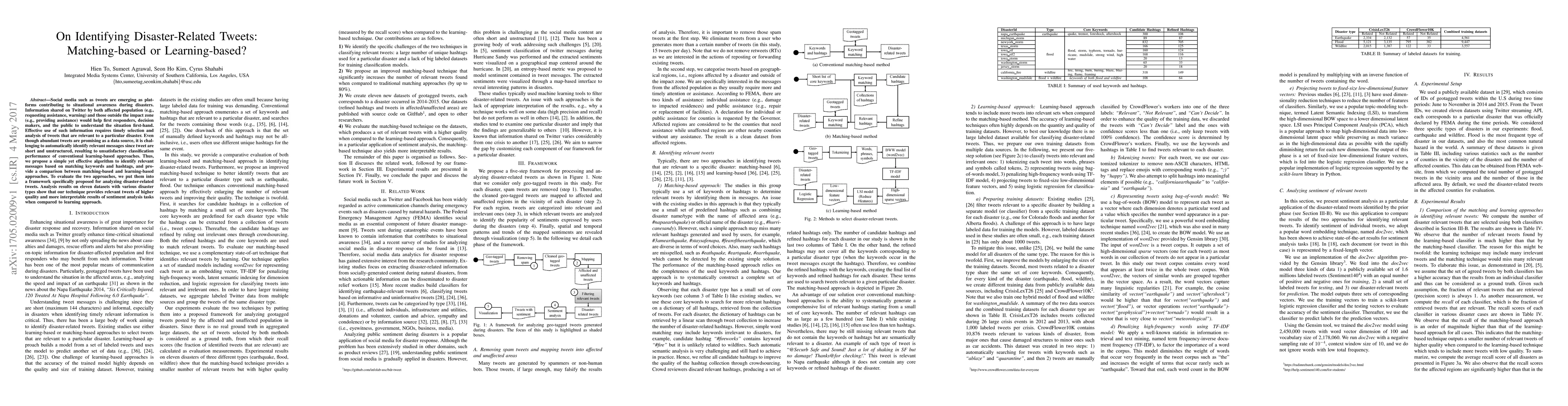 This paper proposes a matching-based algorithm for identifying disaster-related tweets using keywords and hashtags, comparing it against learning-based methods. Results show that the matching-based approach yields higher quality relevant tweets and more interpretable sentiment analysis outcomes across eleven datasets of various disaster types.