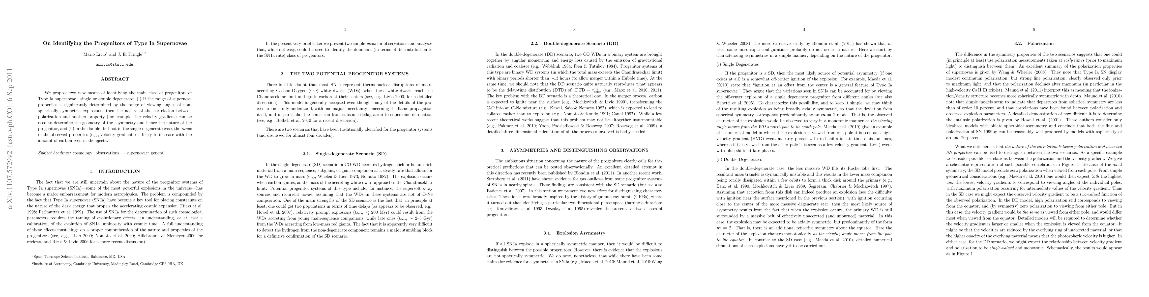 We propose two new means of identifying the main class of progenitors of Type Ia supernovae--single or double degenerate: (i) If the range of supernova properties is significantly determined by the range of viewing angles of non-spherically symmetric explosions, then the nature of the correlation between polarization and another property (for example, the velocity gradient) can be used to determine the geometry of the asymmetry and hence the nature of the progenitor, and (ii) in the double- but not in the single-degenerate case, the range in the observed properties (e.g., velocity gradients) is likely to increase with the amount of carbon seen in the ejecta.