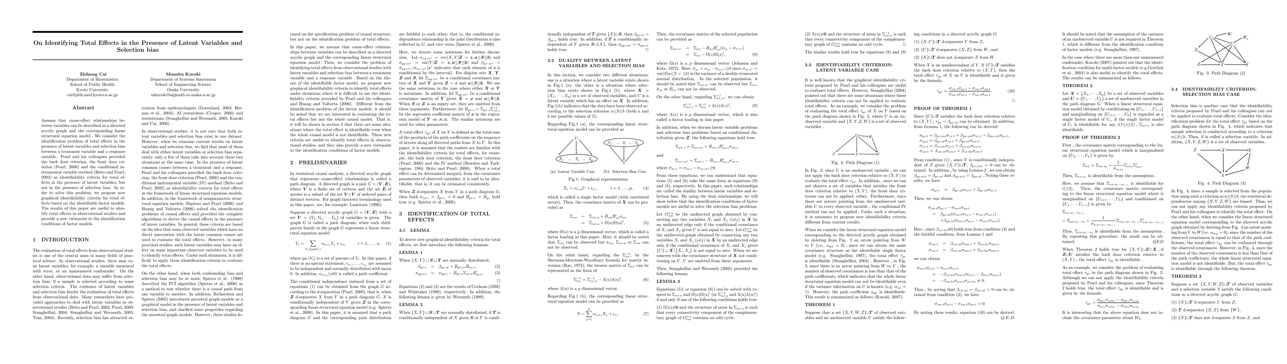 This paper proposes new graphical criteria for identifying total effects in the presence of latent variables and selection bias, extending existing methods like the back door criterion. These criteria are based on identifiable factor models and aim to enhance the identification of total effects in observational studies.