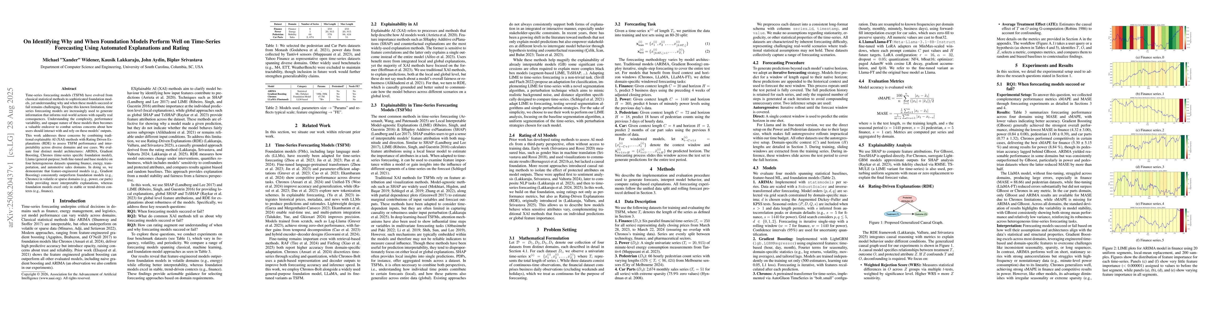 Time-series forecasting models (TSFM) have evolved from classical statistical methods to sophisticated foundation models, yet understanding why and when these models succeed or fail remains challenging. Despite this known limitation, time series forecasting models are increasingly used to generate information that informs real-world actions with equally real consequences. Understanding the complexity, performance variability, and opaque nature of these models then becomes a valuable endeavor to combat serious concerns about how users should interact with and rely on these models' outputs. This work addresses these concerns by combining traditional explainable AI (XAI) methods with Rating Driven Explanations (RDE) to assess TSFM performance and interpretability across diverse domains and use cases. We evaluate four distinct model architectures: ARIMA, Gradient Boosting, Chronos (time-series specific foundation model), Llama (general-purpose; both fine-tuned and base models) on four heterogeneous datasets spanning finance, energy, transportation, and automotive sales domains. In doing so, we demonstrate that feature-engineered models (e.g., Gradient Boosting) consistently outperform foundation models (e.g., Chronos) in volatile or sparse domains (e.g., power, car parts) while providing more interpretable explanations, whereas foundation models excel only in stable or trend-driven contexts (e.g., finance).