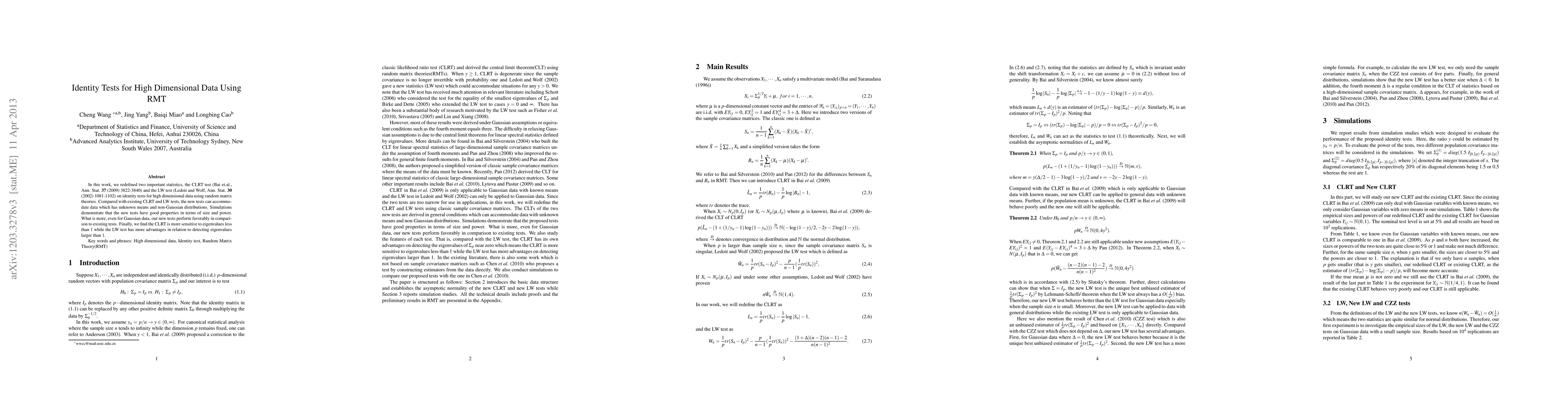 This research paper introduces new identity tests for high-dimensional data using random matrix theories, improving upon existing CLRT and LW tests for non-Gaussian distributions and unknown means, with favorable performance in simulations and comparisons.