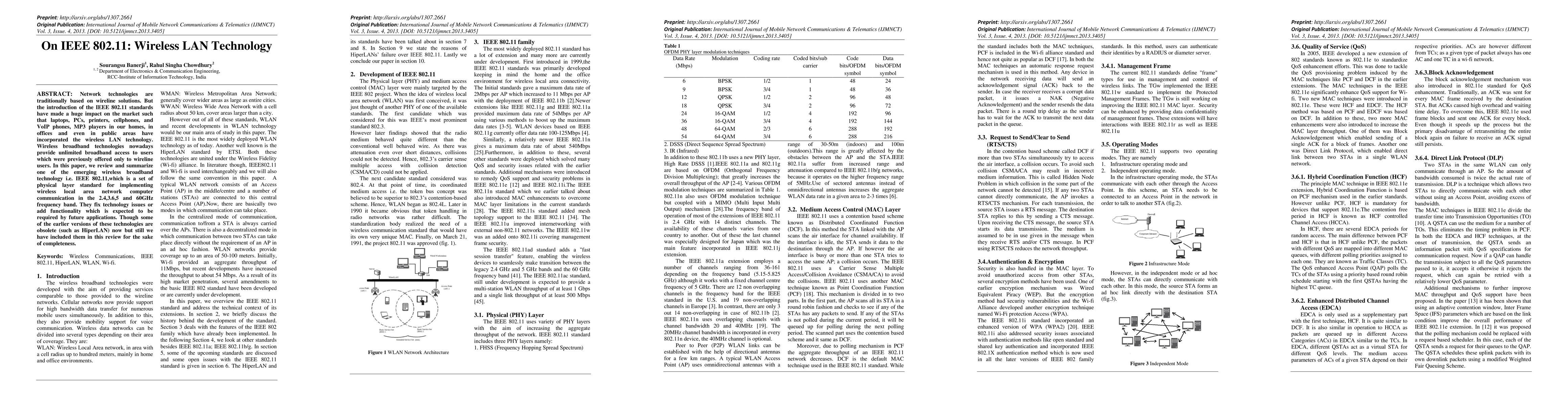 This paper reviews the IEEE 802.11 standards for wireless LAN technology, highlighting its impact on modern devices and its role in providing wireless broadband access across various frequency bands. It also includes obsolete technologies like HiperLAN for comprehensive coverage.