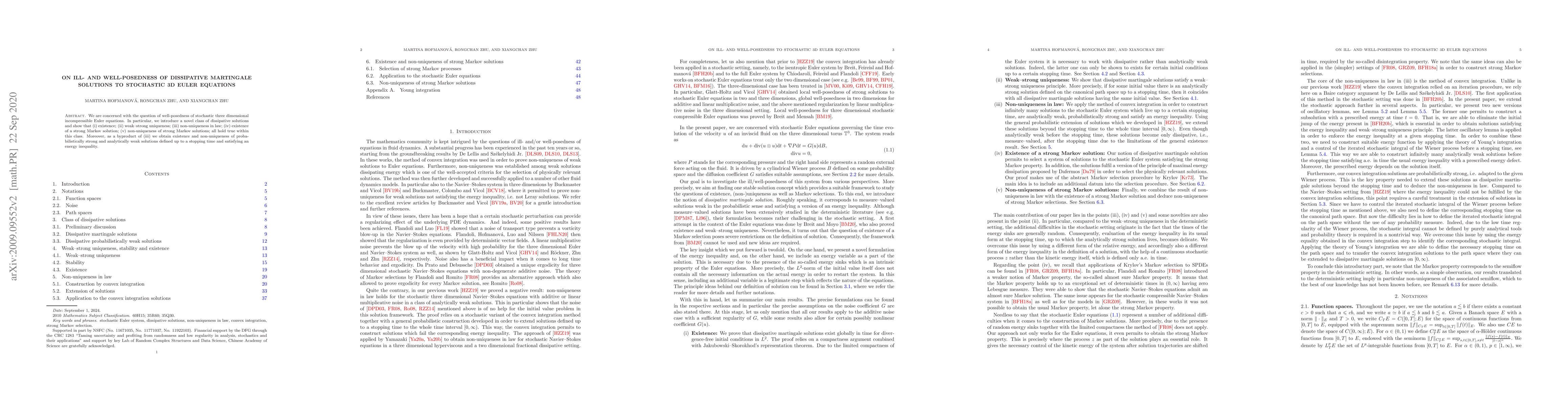 This paper investigates the stochastic three-dimensional incompressible Euler equations, introducing a new class of dissipative martingale solutions. It demonstrates the existence, weak-strong uniqueness, and non-uniqueness of solutions within this class, alongside the existence of strong Markov solutions and their non-uniqueness.