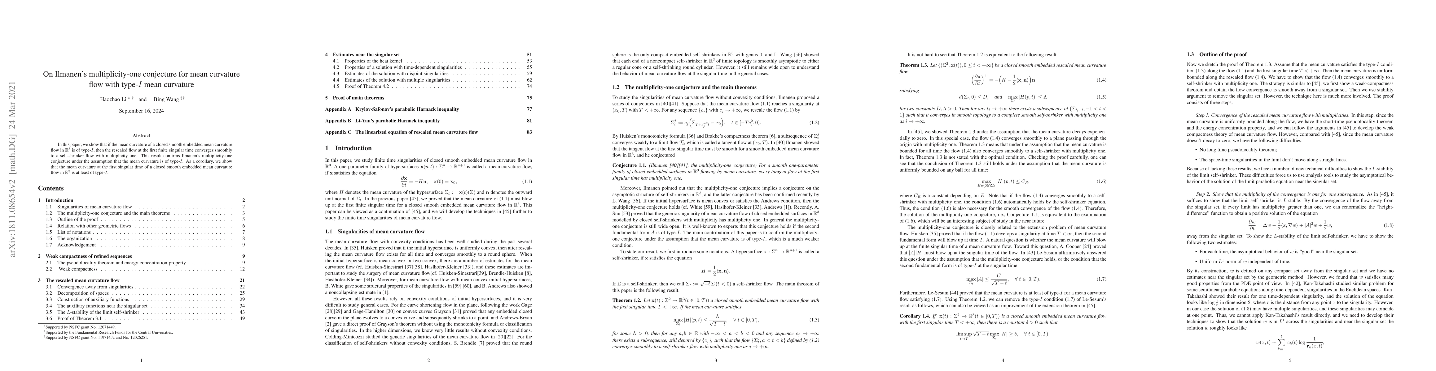 This paper confirms Ilmanen's multiplicity-one conjecture for mean curvature flow with type-I mean curvature, showing that the rescaled flow converges to a self-shrinker flow with multiplicity one. It also proves that the mean curvature at the first singular time must be of type-I.