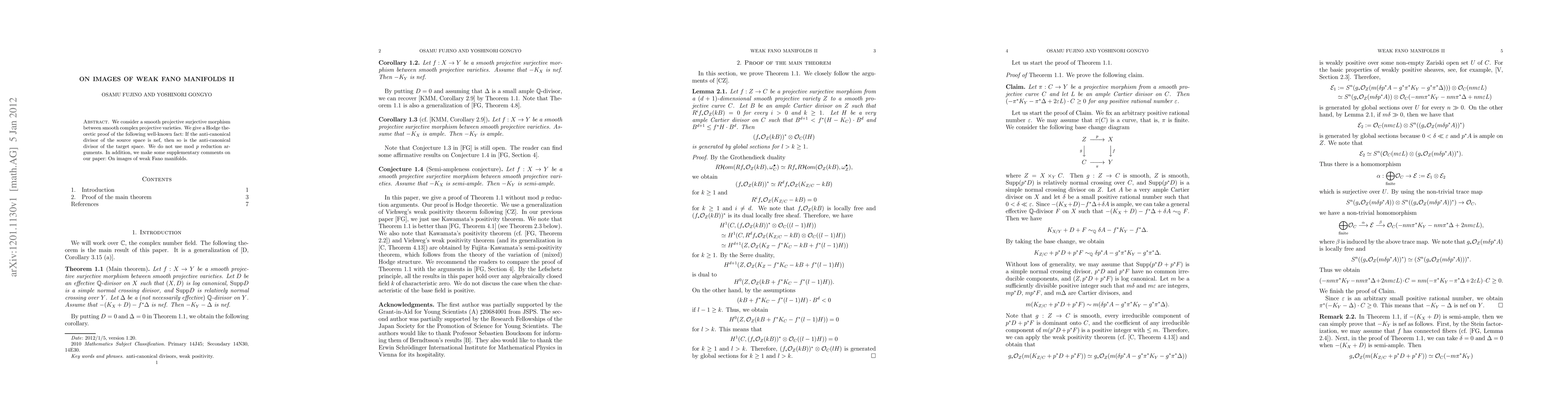 We consider a smooth projective surjective morphism between smooth complex projective varieties. We give a Hodge theoretic proof of the following well-known fact: If the anti-canonical divisor of the source space is nef, then so is the anti-canonical divisor of the target space. We do not use mod $p$ reduction arguments. In addition, we make some supplementary comments on our paper: On images of weak Fano manifolds.