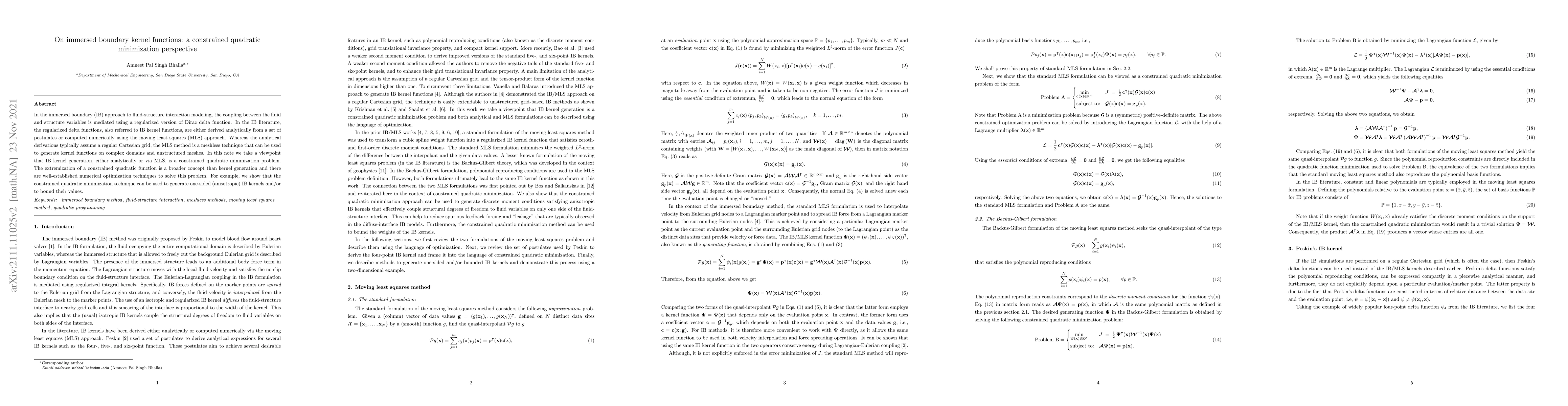 This paper proposes viewing the generation of immersed boundary (IB) kernel functions as a constrained quadratic minimization problem, applicable to both analytical and moving least squares (MLS) methods. It leverages established numerical optimization techniques to generate one-sided IB kernels and to bound their values, offering a unified approach to fluid-structure interaction modeling.