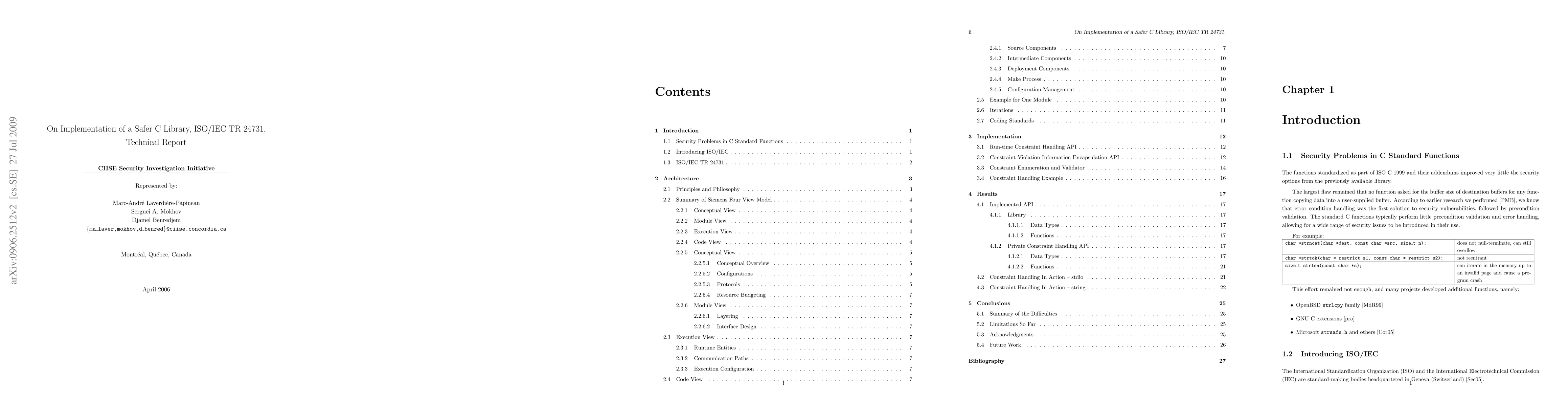 This paper discusses the implementation of ISO/IEC TR 24731, a Safer C library, which introduces 41 new functions to enhance security by enforcing precondition validation and error handling, addressing vulnerabilities in standard C functions. The authors detail their architectural approach using the Siemens Four View Model.