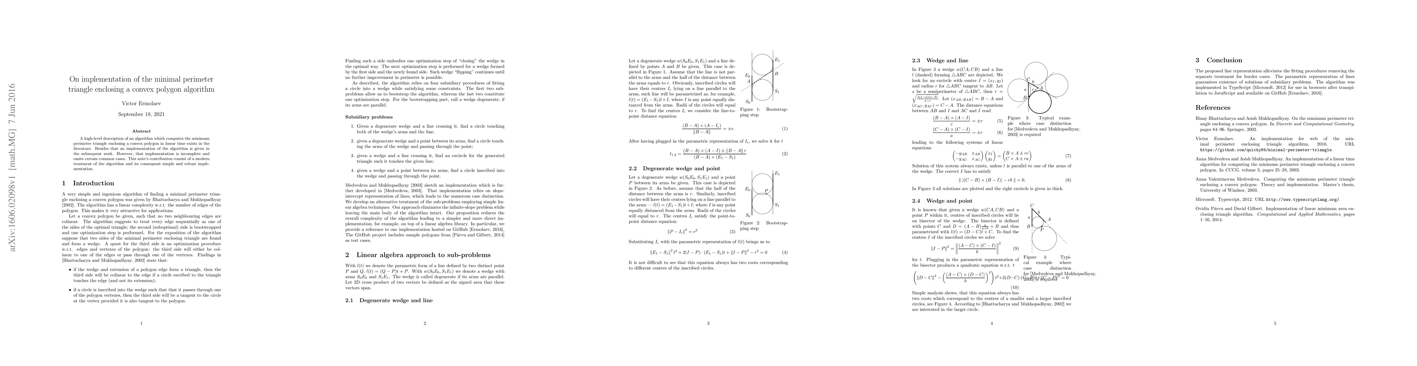 This paper presents a refined implementation of the algorithm for computing the minimum perimeter triangle enclosing a convex polygon, addressing the incompleteness of previous versions and ensuring robust handling of common cases. The new implementation achieves linear time complexity.