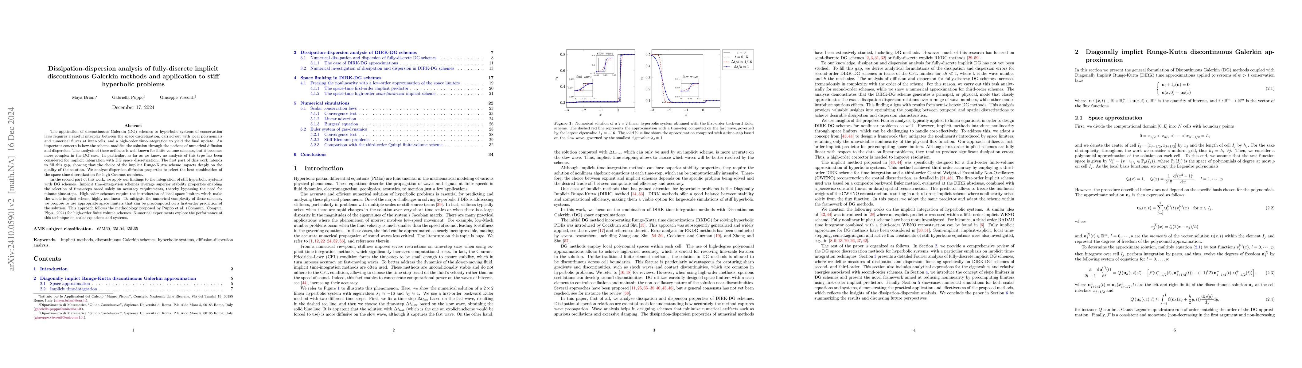 This paper explores high-order diagonally implicit Runge-Kutta methods combined with discontinuous Galerkin space reconstructions for solving stiff hyperbolic conservation laws. It analyzes dispersion-diffusion properties to optimize the space-time discretization for high Courant numbers while controlling spurious oscillations.