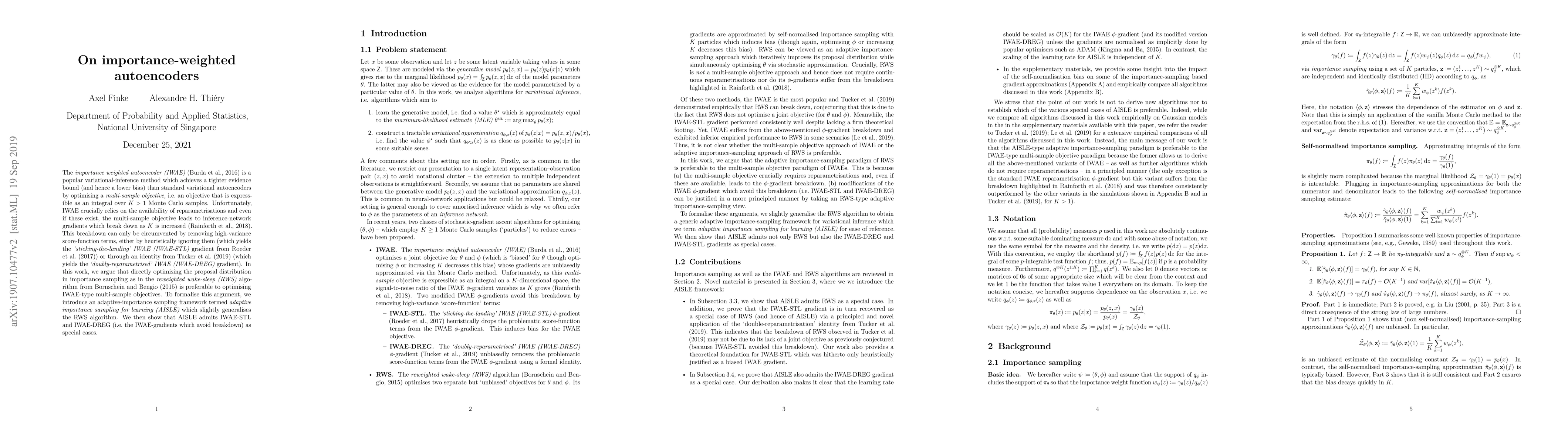 This paper discusses the importance weighted autoencoder (IWAE) and its limitations, particularly the breakdown of gradients with increased samples. It proposes an adaptive-importance sampling framework called AISLE, which generalizes the reweighted wake-sleep algorithm and can incorporate IWAE-STL and IWAE-DREG as special cases, offering a more stable optimization approach.