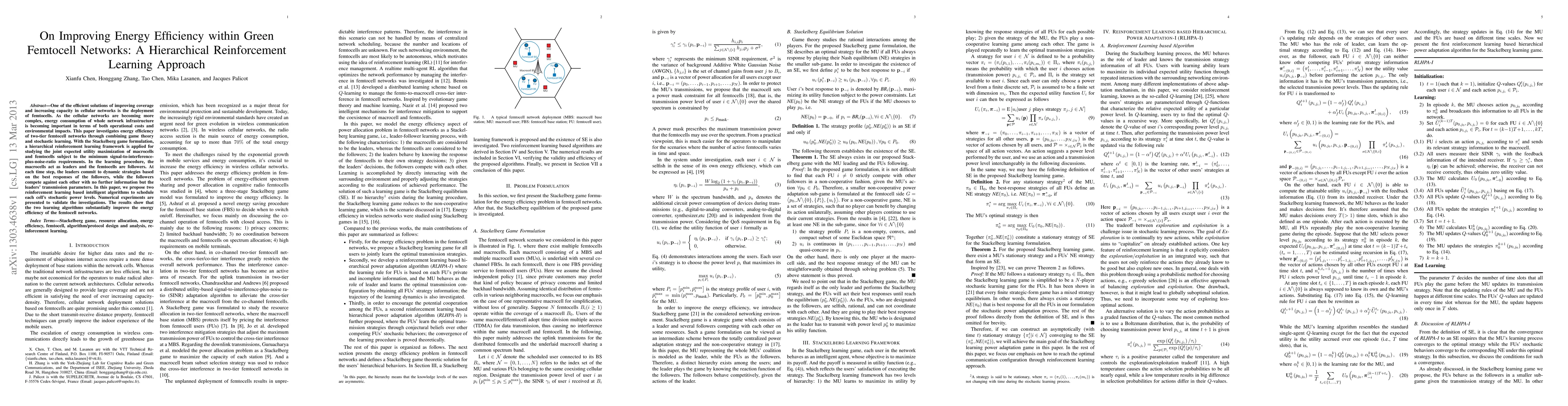 This paper proposes a hierarchical reinforcement learning approach to enhance energy efficiency in two-tier femtocell networks, using a Stackelberg game framework where macrocells lead and femtocells follow. The study demonstrates significant improvements in energy efficiency through numerical experiments.