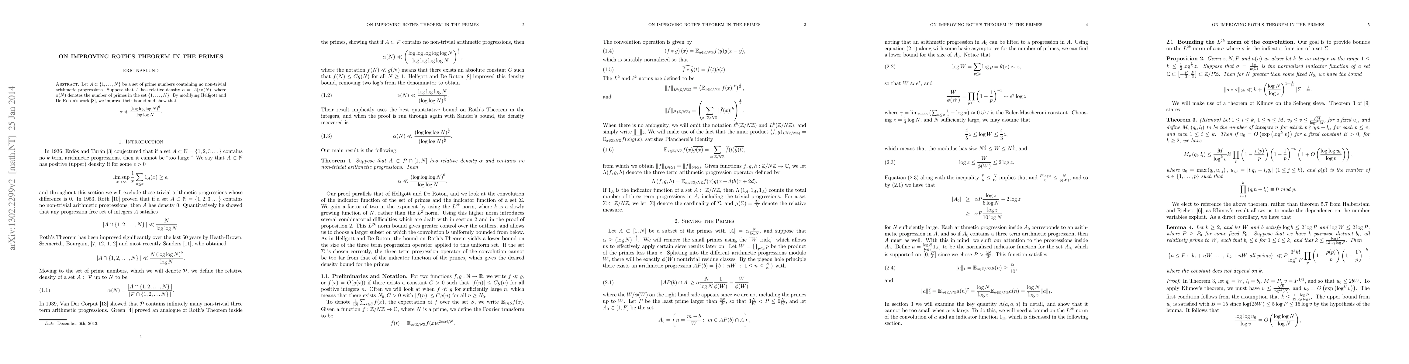 Let $A\subset\left\{ 1,\dots,N\right\} $ be a set of prime numbers containing no non-trivial arithmetic progressions. Suppose that $A$ has relative density $\alpha=|A|/\pi(N)$, where $\pi(N)$ denotes the number of primes in the set $\left\{ 1,\dots,N\right\} $. By modifying Helfgott and De Roton's work, we improve their bound and show that $$\alpha\ll\frac{\left(\log\log\log N\right)^{6}}{\log\log N}.$$