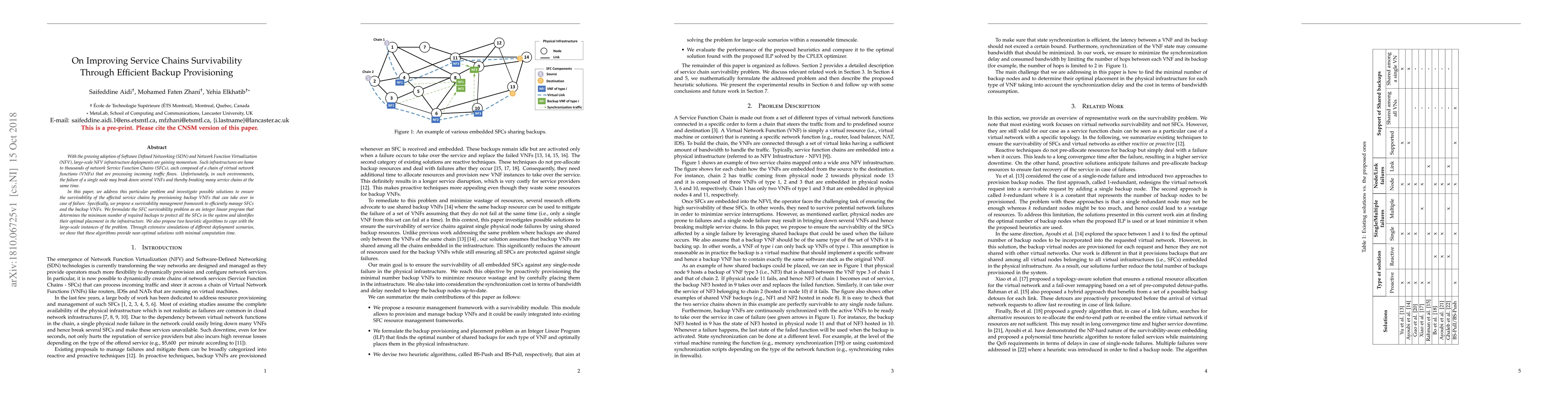 This paper proposes a survivability management framework to ensure network Service Function Chains (SFCs) survive single node failures by provisioning backup VNFs, providing near-optimal solutions with minimal computation time.