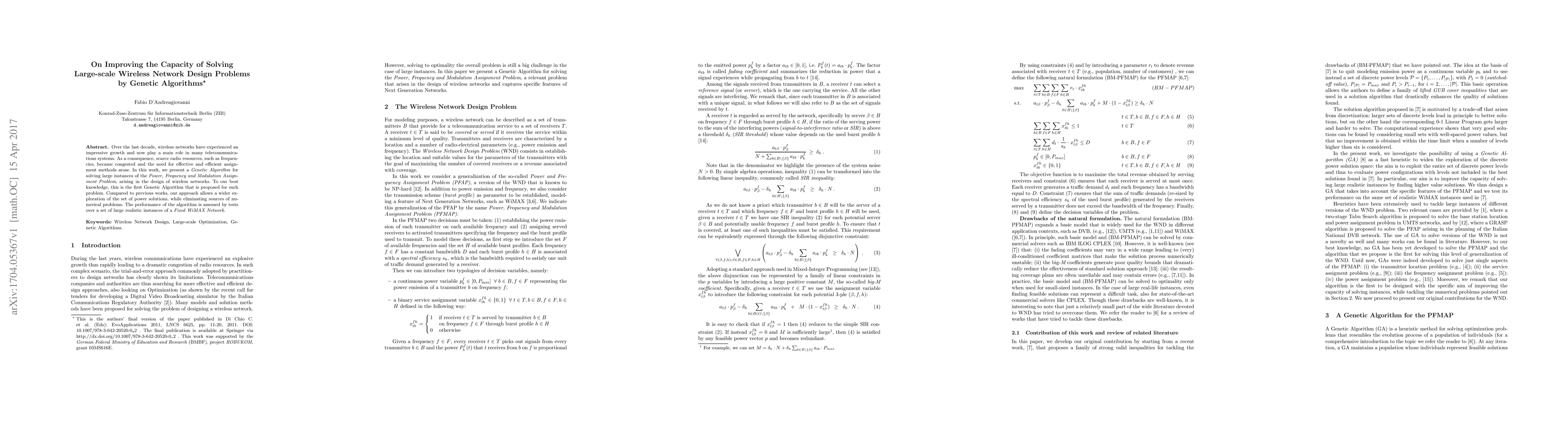 A Genetic Algorithm is proposed to efficiently design wireless networks with limited radio resources, outperforming previous approaches in solving large-scale problems.