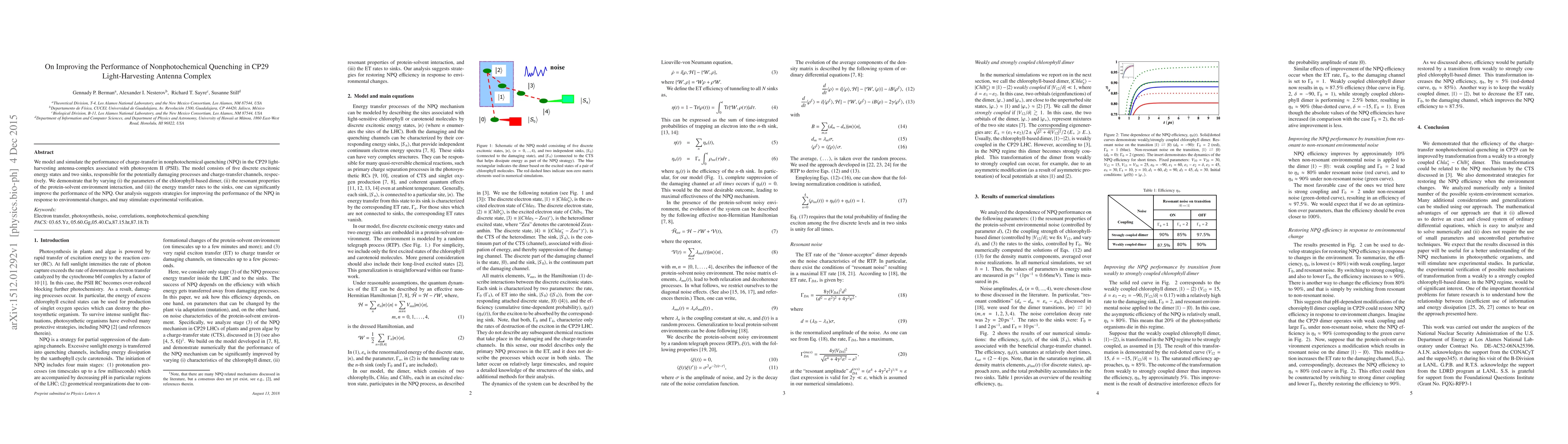 We model and simulate the performance of charge-transfer in nonphotochemical quenching (NPQ) in the CP29 light-harvesting antenna-complex associated with photosystem II (PSII). The model consists of five discrete excitonic energy states and two sinks, responsible for the potentially damaging processes and charge-transfer channels, respectively. We demonstrate that by varying (i) the parameters of the chlorophyll-based dimer, (ii) the resonant properties of the protein-solvent environment interaction, and (iii) the energy transfer rates to the sinks, one can significantly improve the performance of the NPQ. Our analysis suggests strategies for improving the performance of the NPQ in response to environmental changes, and may stimulate experimental verification.