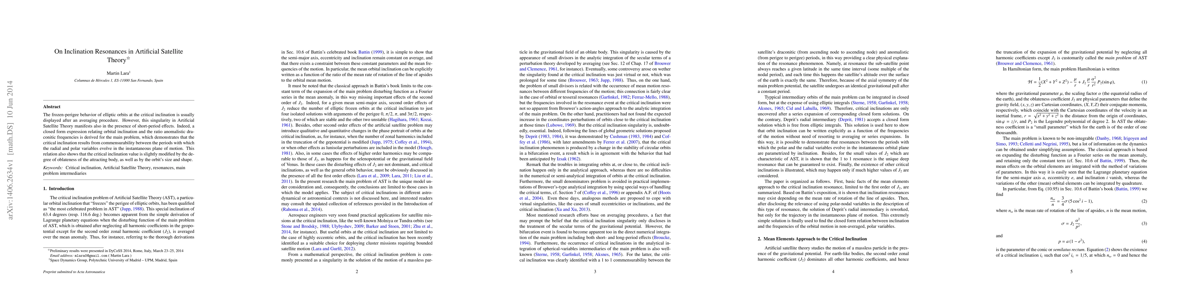 The frozen-perigee behavior of elliptic orbits at the critical inclination is usually displayed after an averaging procedure. However, this singularity in Artificial Satellite Theory manifests also in the presence of short-period effects. Indeed, a closed form expression relating orbital inclination and the ratio anomalistic draconitic frequencies is derived for the main problem, which demonstrates that the critical inclination results from commensurability between the periods with which the radial and polar variables evolve in the instantaneous plane of motion. This relation also shows that the critical inclination value is slightly modified by the degree of oblateness of the attracting body, as well as by the orbit's size and shape.