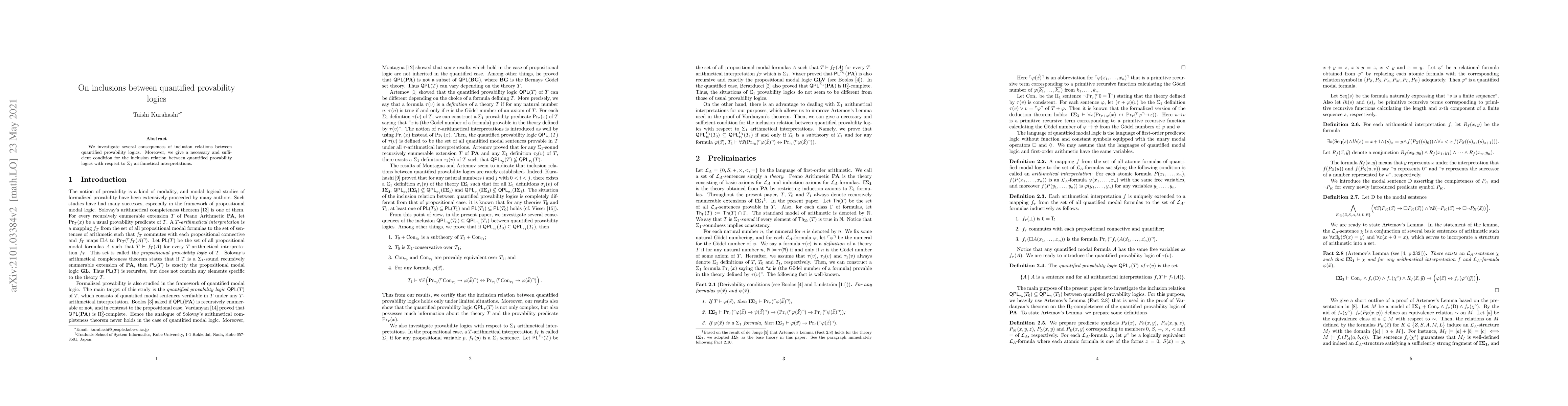 We investigate several consequences of inclusion relations between quantified provability logics. Moreover, we give a necessary and sufficient condition for the inclusion relation between quantified provability logics with respect to $\Sigma_1$ arithmetical interpretations.