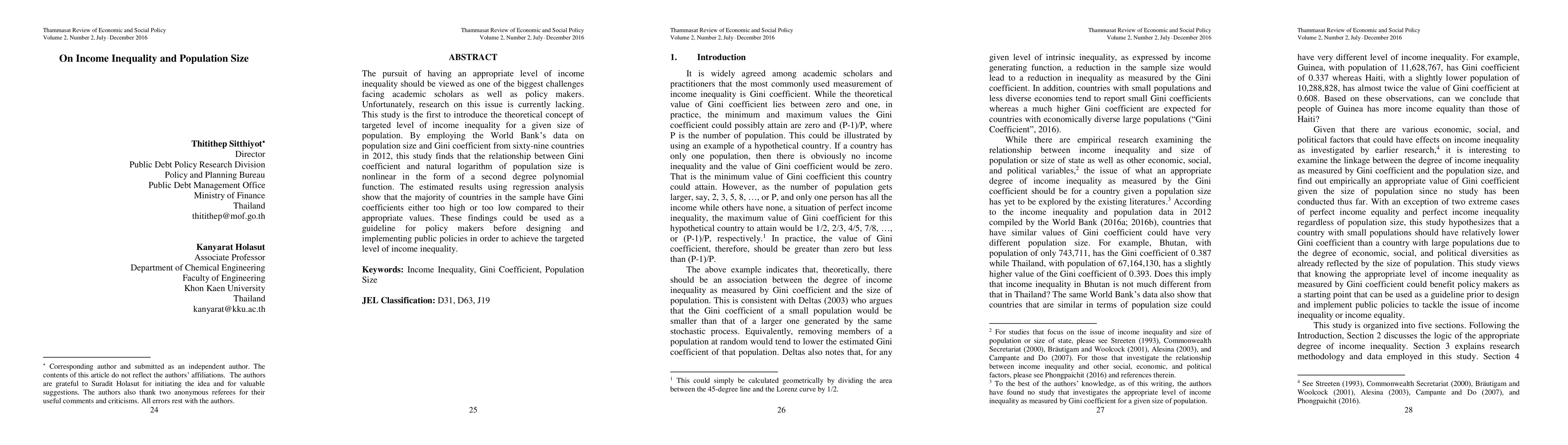 This study introduces the concept of an ideal income inequality level for a given population size using World Bank data from 69 countries in 2012. It finds a nonlinear relationship between population size and income inequality (Gini coefficient), suggesting most countries have either higher or lower inequality than the optimal level, aiding policymakers in targeting income equality.