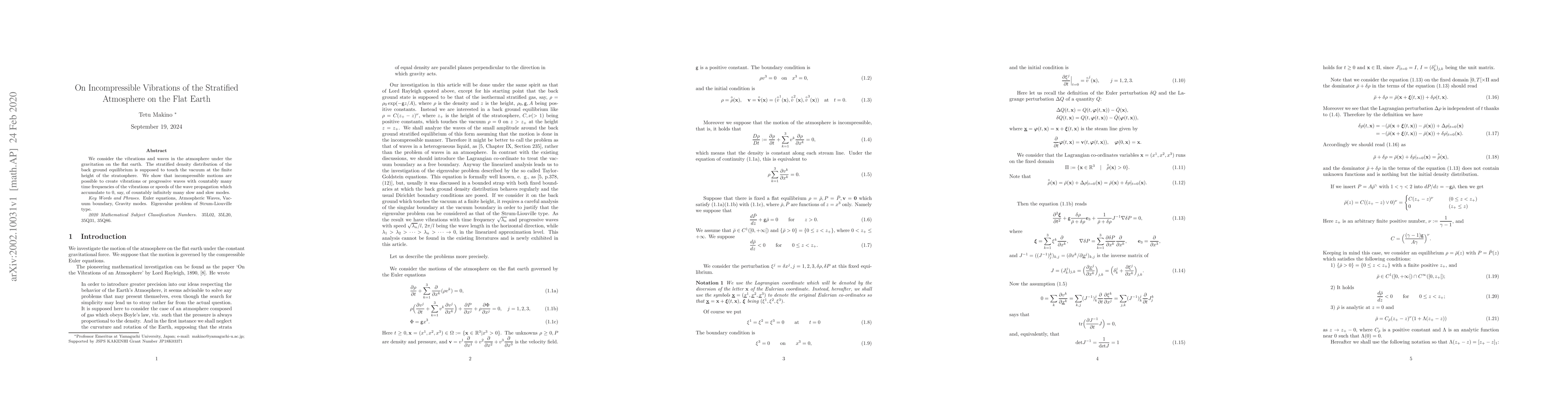 Summary: The paper investigates vibrations and waves in a stratified atmosphere on a flat Earth, demonstrating that incompressible motions can generate progressive waves with an infinite set of slow vibration frequencies, highlighting unique wave propagation modes.