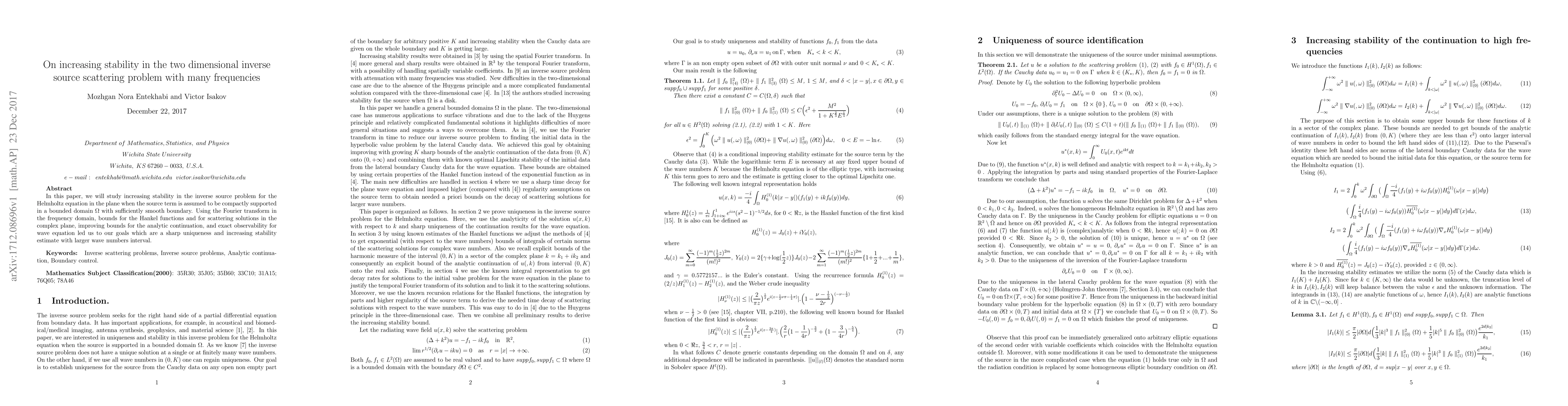 This paper investigates the stability enhancement in the inverse source scattering problem for the Helmholtz equation in two dimensions, focusing on compactly supported sources. It employs Fourier transform, improved bounds for Hankel functions, and exact observability to achieve sharp uniqueness and stability estimates over a larger wave number interval.