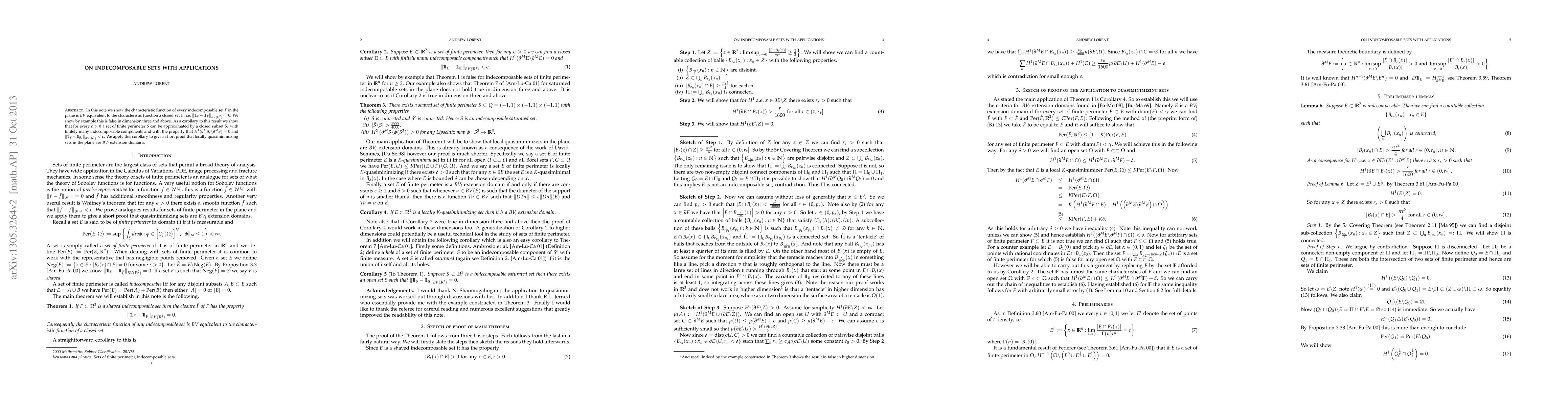 The paper establishes a fundamental equivalence for indecomposable sets in the plane and provides a method for approximating sets of finite perimeter with controlled properties, advancing the theory of sets of finite perimeter.