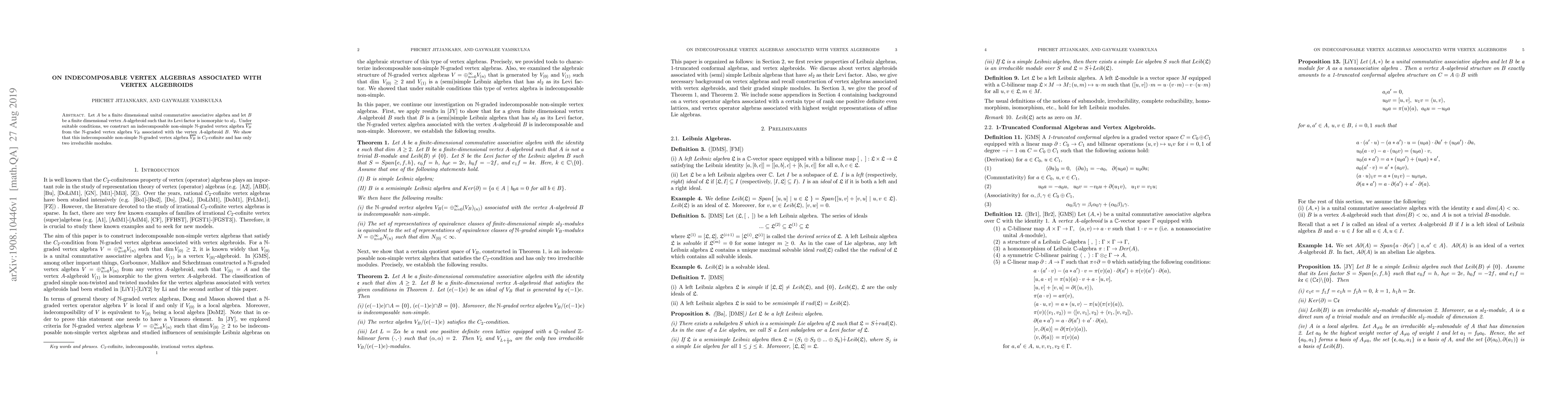 Let $A$ be a finite dimensional unital commutative associative algebra and let $B$ be a finite dimensional vertex $A$-algebroid such that its Levi factor is isomorphic to $sl_2$. Under suitable conditions, we construct an indecomposable non-simple $\mathbb{N}$-graded vertex algebra $\overline{V_B}$ from the $\mathbb{N}$-graded vertex algebra $V_B$ associated with the vertex $A$-algebroid $B$. We show that this indecomposable non-simple $\mathbb{N}$-graded vertex algebra $\overline{V_B}$ is $C_2$-cofinite and has only two irreducible modules.