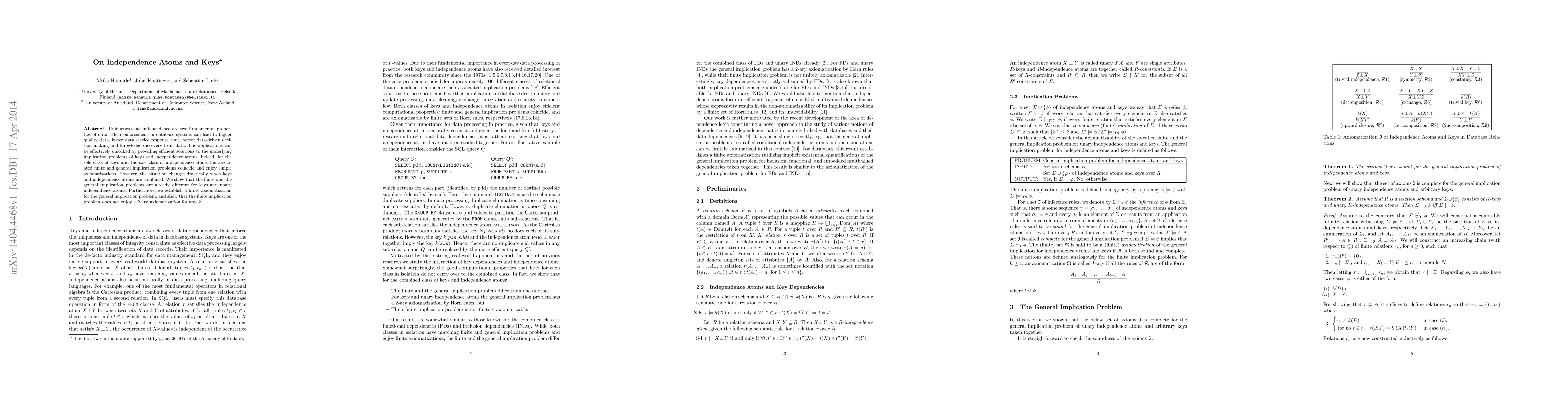 This paper explores the fundamental properties of uniqueness and independence in databases, highlighting their benefits for data quality and decision-making. It reveals that while keys and independence atoms have coinciding implication problems individually, their combination leads to different finite and general implication problems, and presents a finite axiomatization for the general case.
