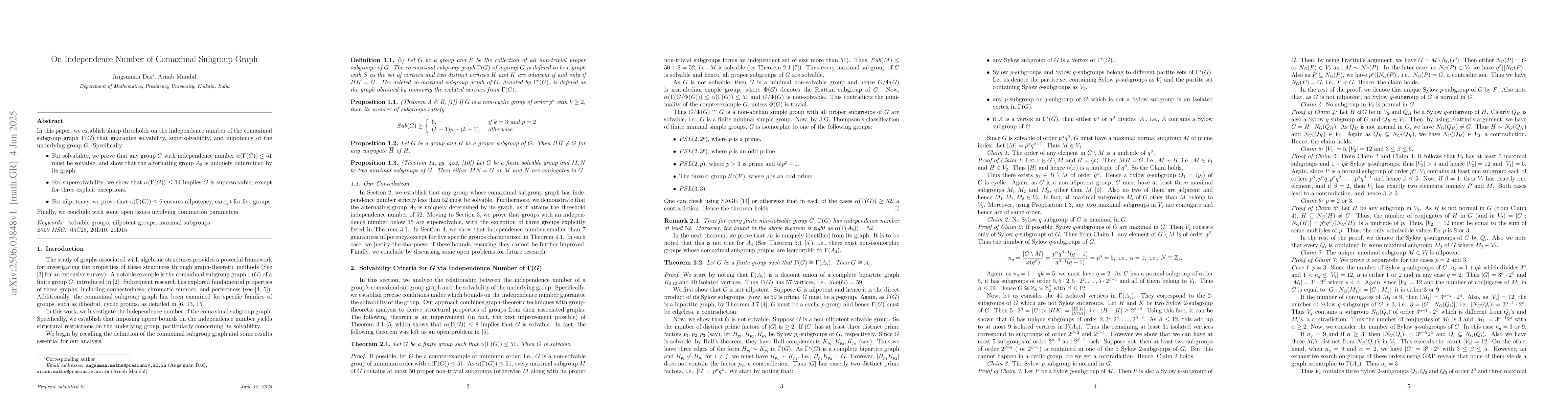 In this paper, we establish sharp thresholds on the independence number of the comaximal subgroup graph $\Gamma(G)$ that guarantee solvability, supersolvability, and nilpotency of the underlying group $G$. Specifically: \begin{itemize} \item For solvability, we prove that any group $G$ with independence number $\alpha(\Gamma(G))\leq 51$ must be solvable, and show that the alternating group $A_5$ is uniquely determined by its graph. \item For supersolvability, we show that $\alpha(\Gamma(G))\leq 14$ implies $G$ is supersolvable, except for three explicit exceptions. \item For nilpotency, we prove that $\alpha(\Gamma(G))\leq 6$ ensures nilpotency, except for five groups. \end{itemize} Finally, we conclude with some open issues involving domination parameters.