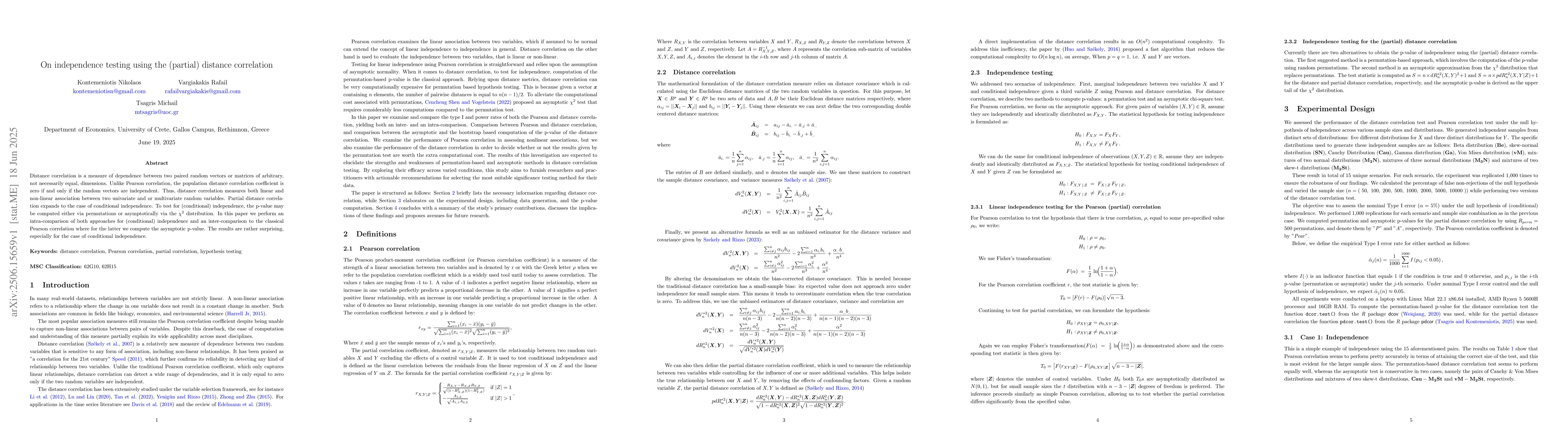 Distance correlation is a measure of dependence between two paired random vectors or matrices of arbitrary, not necessarily equal, dimensions. Unlike Pearson correlation, the population distance correlation coefficient is zero if and only if the random vectors are independent. Thus, distance correlation measures both linear and non-linear association between two univariate and or multivariate random variables. Partial distance correlation expands to the case of conditional independence. To test for (conditional) independence, the p-value may be computed either via permutations or asymptotically via the $\chi^2$ distribution. In this paper we perform an intra-comparison of both approaches for (conditional) independence and an inter-comparison to the classical Pearson correlation where for the latter we compute the asymptotic p-value. The results are rather surprising, especially for the case of conditional independence.