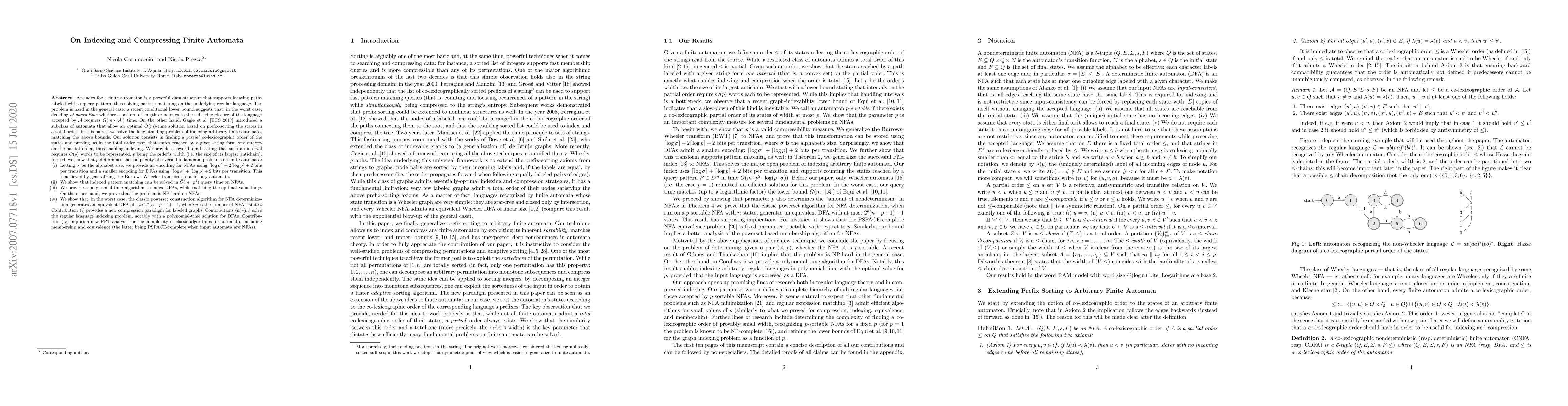 An index for a finite automaton is a powerful data structure that supports locating paths labeled with a query pattern, thus solving pattern matching on the underlying regular language. In this paper, we solve the long-standing problem of indexing arbitrary finite automata. Our solution consists in finding a partial co-lexicographic order of the states and proving, as in the total order case, that states reached by a given string form one interval on the partial order, thus enabling indexing. We provide a lower bound stating that such an interval requires $O(p)$ words to be represented, $p$ being the order's width (i.e. the size of its largest antichain). Indeed, we show that $p$ determines the complexity of several fundamental problems on finite automata: (i) Letting $\sigma$ be the alphabet size, we provide an encoding for NFAs using $\lceil\log \sigma\rceil + 2\lceil\log p\rceil + 2$ bits per transition and a smaller encoding for DFAs using $\lceil\log \sigma\rceil + \lceil\log p\rceil + 2$ bits per transition. This is achieved by generalizing the Burrows-Wheeler transform to arbitrary automata. (ii) We show that indexed pattern matching can be solved in $\tilde O(m\cdot p^2)$ query time on NFAs. (iii) We provide a polynomial-time algorithm to index DFAs, while matching the optimal value for $ p $. On the other hand, we prove that the problem is NP-hard on NFAs. (iv) We show that, in the worst case, the classic powerset construction algorithm for NFA determinization generates an equivalent DFA of size $2^p(n-p+1)-1$, where $n$ is the number of NFA's states.