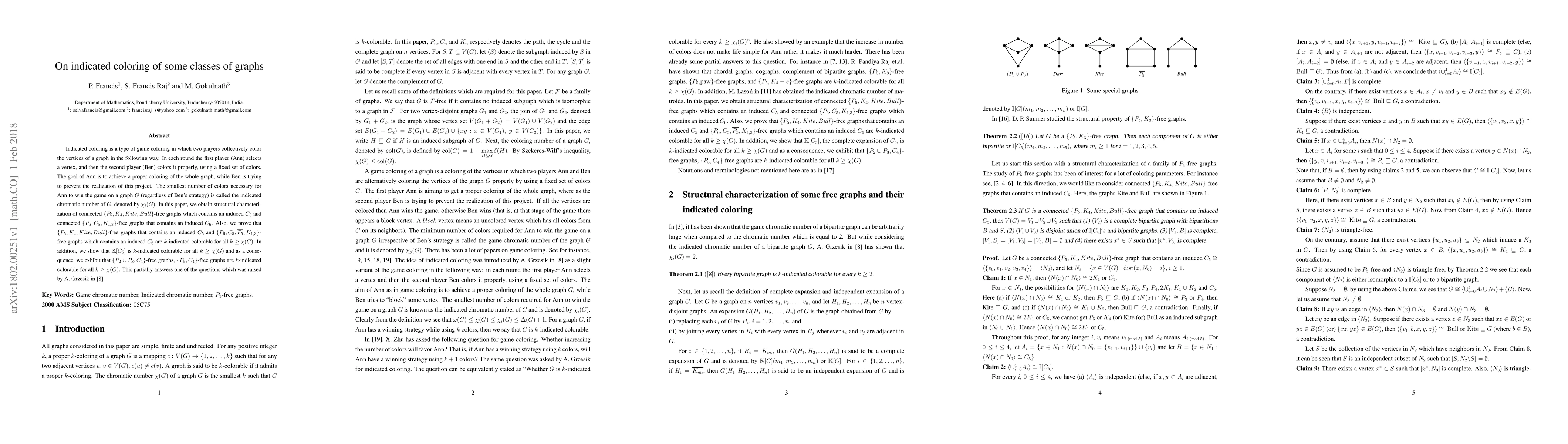 Indicated coloring is a type of game coloring in which two players collectively color the vertices of a graph in the following way. In each round the first player (Ann) selects a vertex, and then the second player (Ben) colors it properly, using a fixed set of colors. The goal of Ann is to achieve a proper coloring of the whole graph, while Ben is trying to prevent the realization of this project. The smallest number of colors necessary for Ann to win the game on a graph $G$ (regardless of Ben's strategy) is called the indicated chromatic number of $G$, denoted by $\chi_i(G)$. In this paper, we obtain structural characterization of connected $\{P_5,K_4,Kite,Bull\}$-free graphs which contains an induced $C_5$ and connected $\{P_6,C_5, K_{1,3}\}$-free graphs that contains an induced $C_6$. Also, we prove that $\{P_5,K_4,Kite,Bull\}$-free graphs that contains an induced $C_5$ and $\{P_6,C_5,\overline{P_5}, K_{1,3}\}$-free graphs which contains an induced $C_6$ are $k$-indicated colorable for all $k\geq\chi(G)$. In addition, we show that $\mathbb{K}[C_5]$ is $k$-indicated colorable for all $k\geq\chi(G)$ and as a consequence, we exhibit that $\{P_2\cup P_3, C_4\}$-free graphs, $\{P_5,C_4\}$-free graphs are $k$-indicated colorable for all $k\geq\chi(G)$. This partially answers one of the questions which was raised by A. Grzesik in \cite{and}.