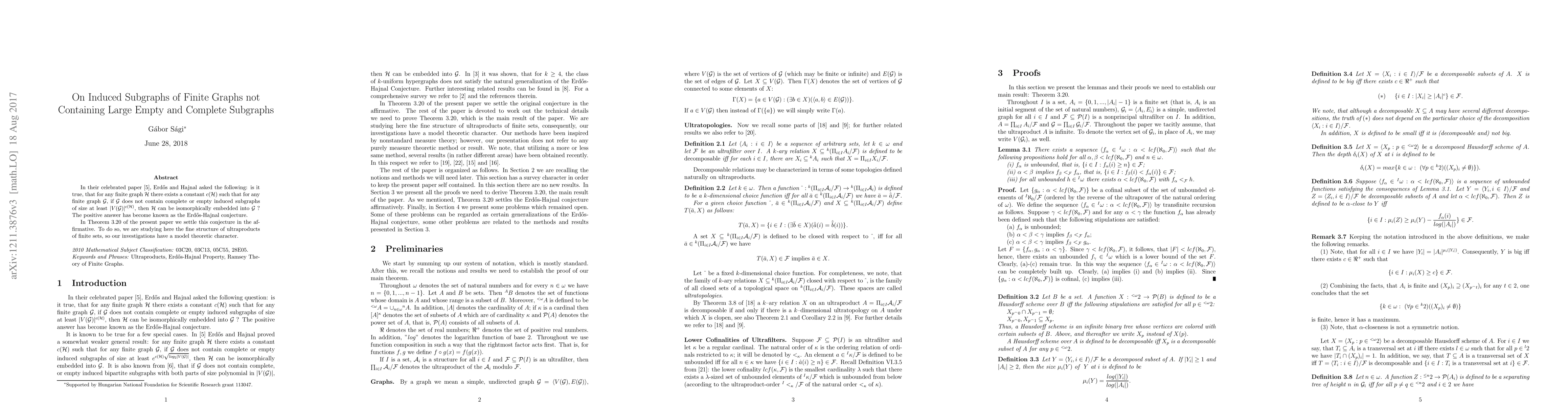 In their celebrated paper [Ramsey-Type Theorems, Discrete Appl. Math. 25 (1989) 37-52], Erd\H{o}s and Hajnal asked the following: is it true, that for any finite graph H there exists a constant c(H) such that for any finite graph G, if G does not contain complete or empty induced subgraphs of size at least |V(G)|^c(H), then H can be isomorphically embedded into G ? The positive answer has become known as the Erd\H{o}s-Hajnal conjecture. In Theorem 3.20 of the present paper we settle this conjecture in the affirmative. To do so, we are studying here the fine structure of ultraproducts of finite sets, so our investigations have a model theoretic character.
