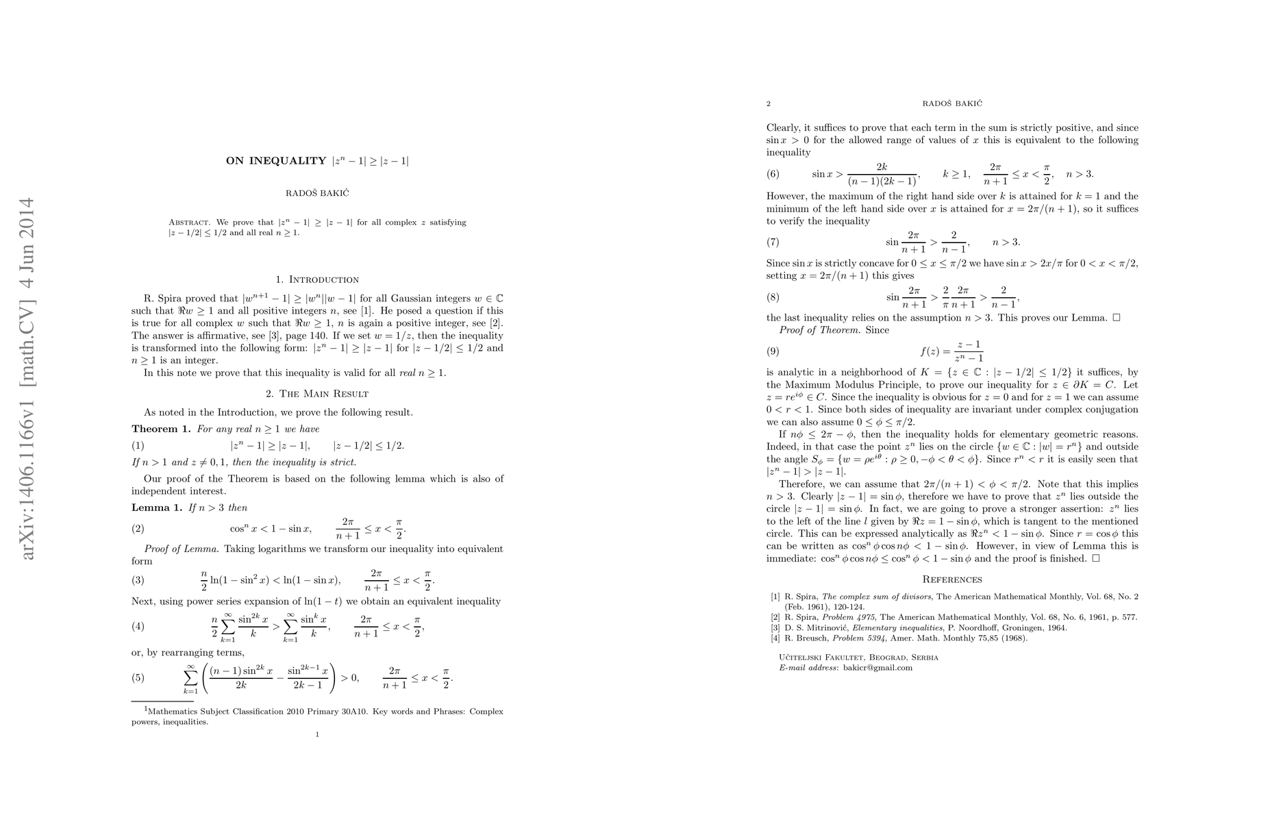 It is known that inequality $|z^n-1|\geq|z-1|$ holds on the circle $|z-1/2|= 1/2$, where $n$ is a positive integer. We prove that in fact $n$ can be real number not less then 1. We also prove following inequality as a lemma: $cos^nx\lt 1-sinx$ for real $n\gt3$ and $2\pi/(n+1)\leq x \lt \pi/2$.