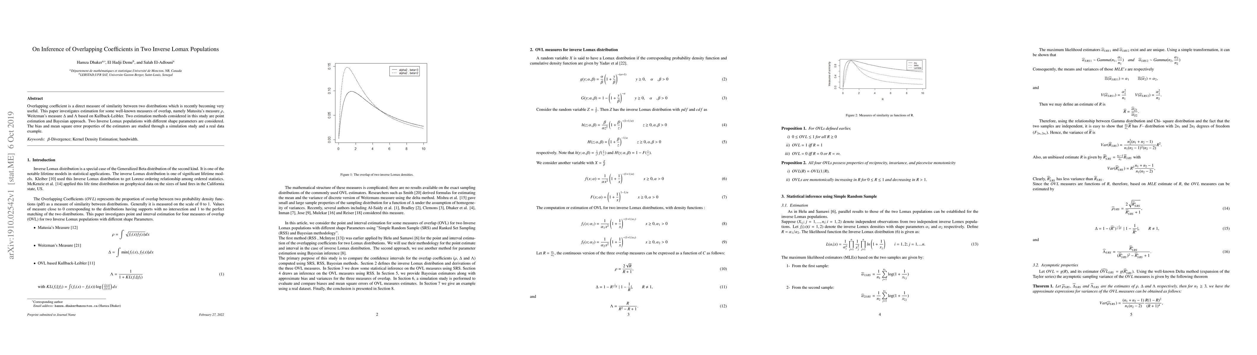 Overlapping coefficient is a direct measure of similarity between two distributions which is recently becoming very useful. This paper investigates estimation for some well-known measures of overlap, namely Matusita's measure $\rho$, Weitzman's measure $\Delta$ and $\Lambda$ based on Kullback-Leibler. Two estimation methods considered in this study are point estimation and Bayesian approach. Two Inverse Lomax populations with different shape parameters are considered. The bias and mean square error properties of the estimators are studied through a simulation study and a real data example.