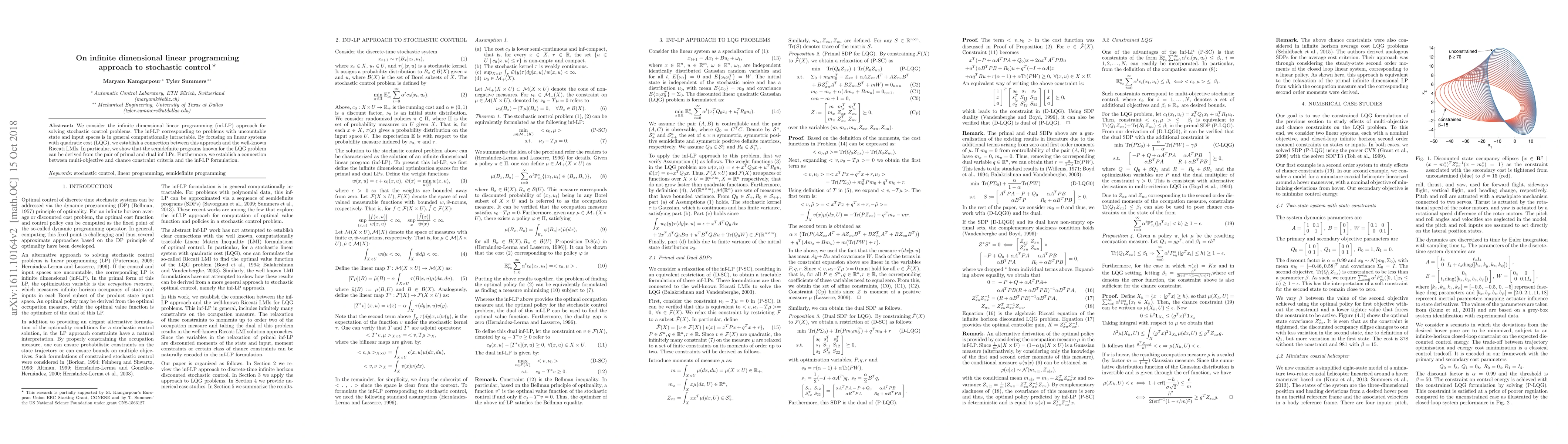 This research paper explores an infinite dimensional linear programming approach to solve stochastic control problems, establishing connections with well-known Riccati LMI solutions and multi-objective chance constraint criteria.